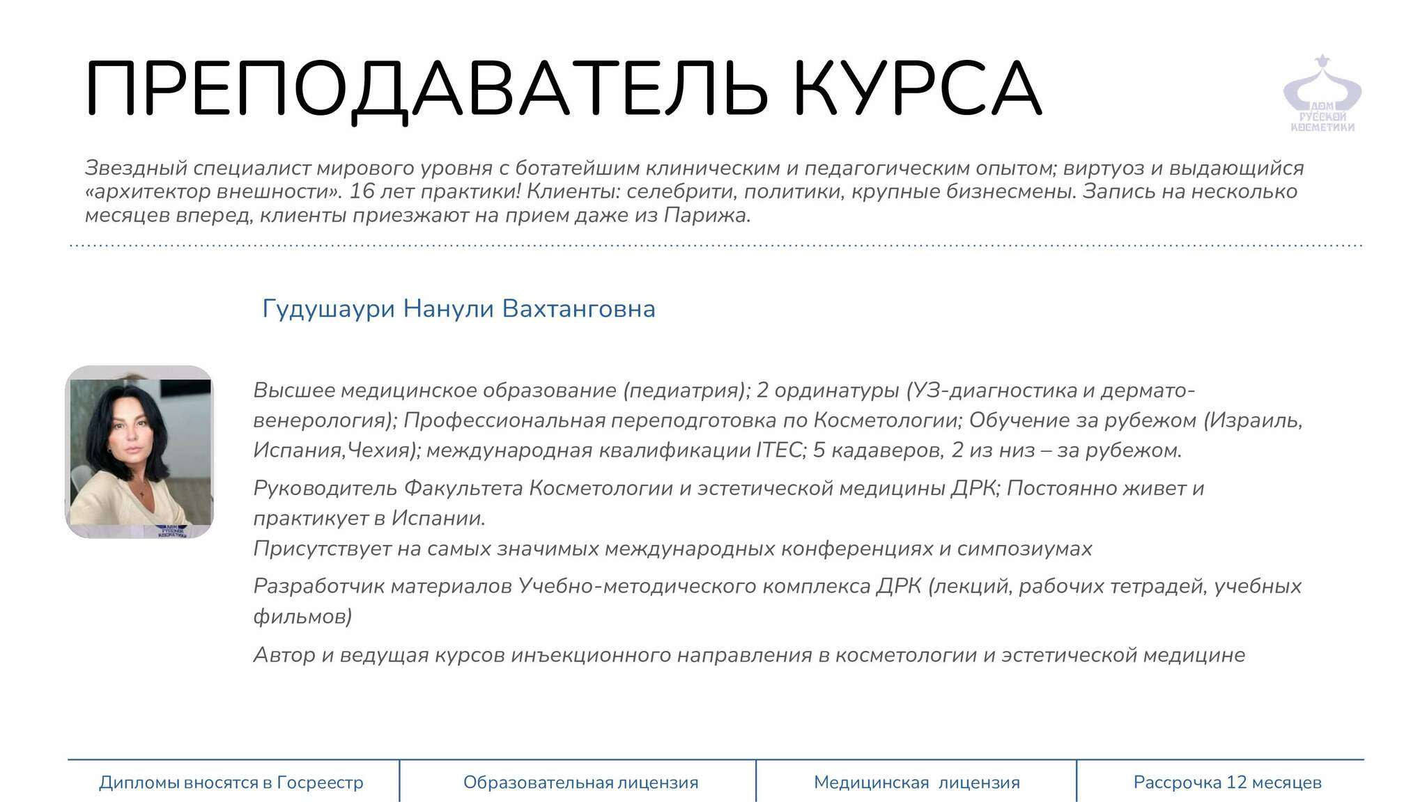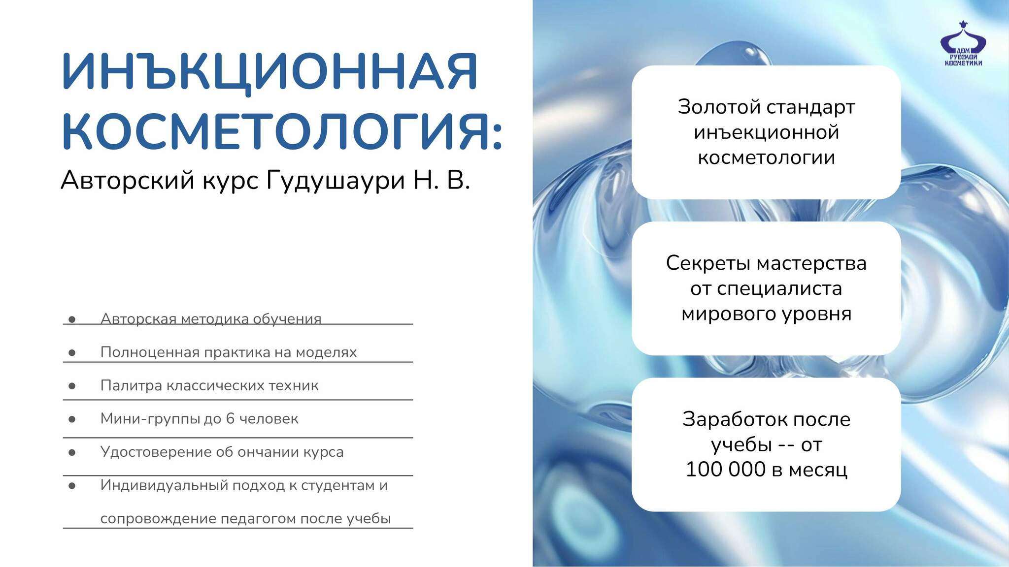Авторский курс от руководителя инъекционного направления Н.В. Гудушаури. В курс входят: ботулинотерапия, мезотерапия, биоревитализация, контурная пластика