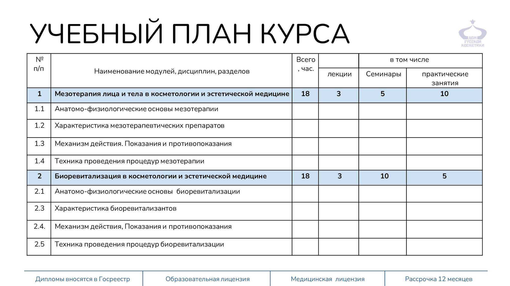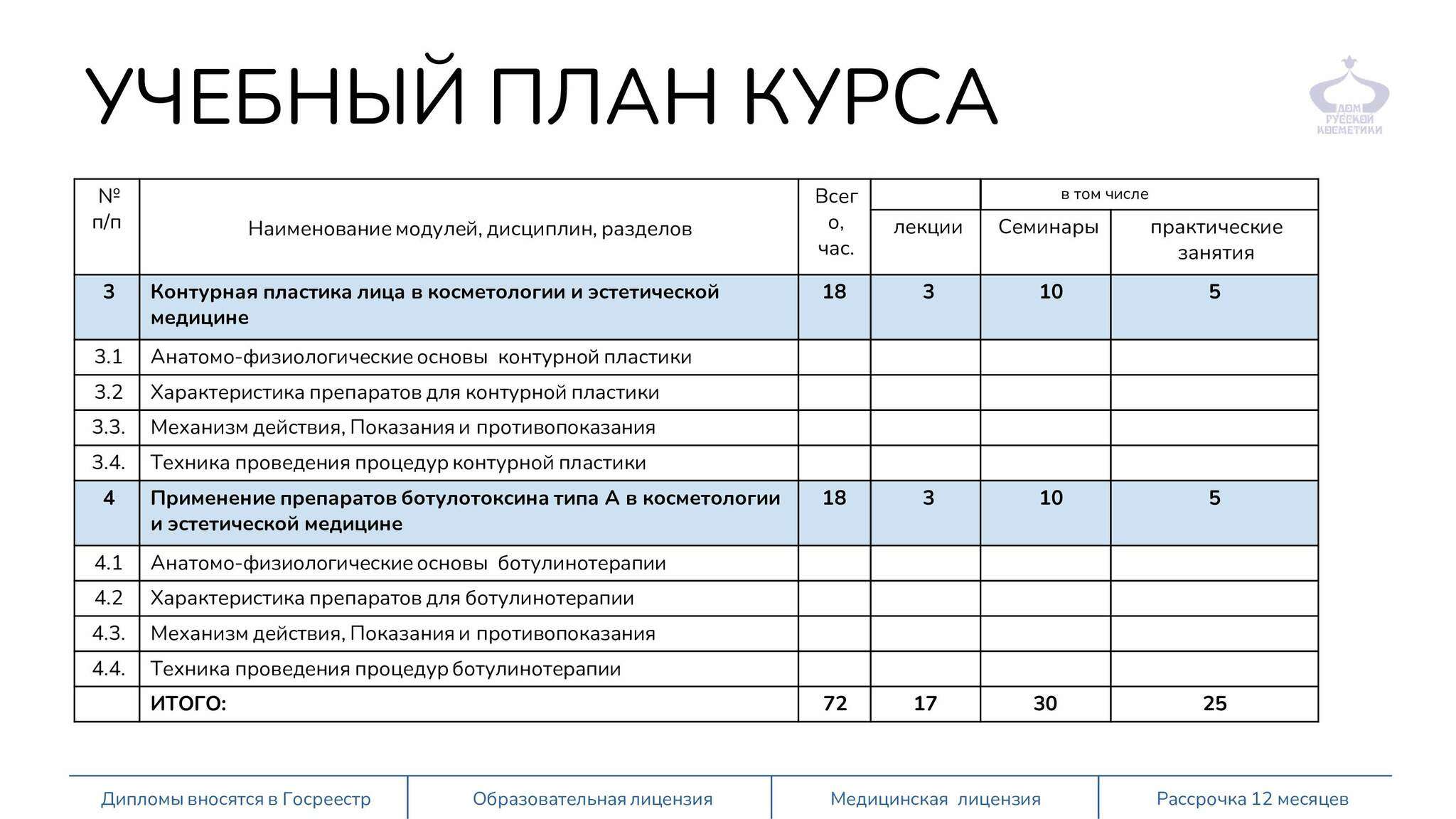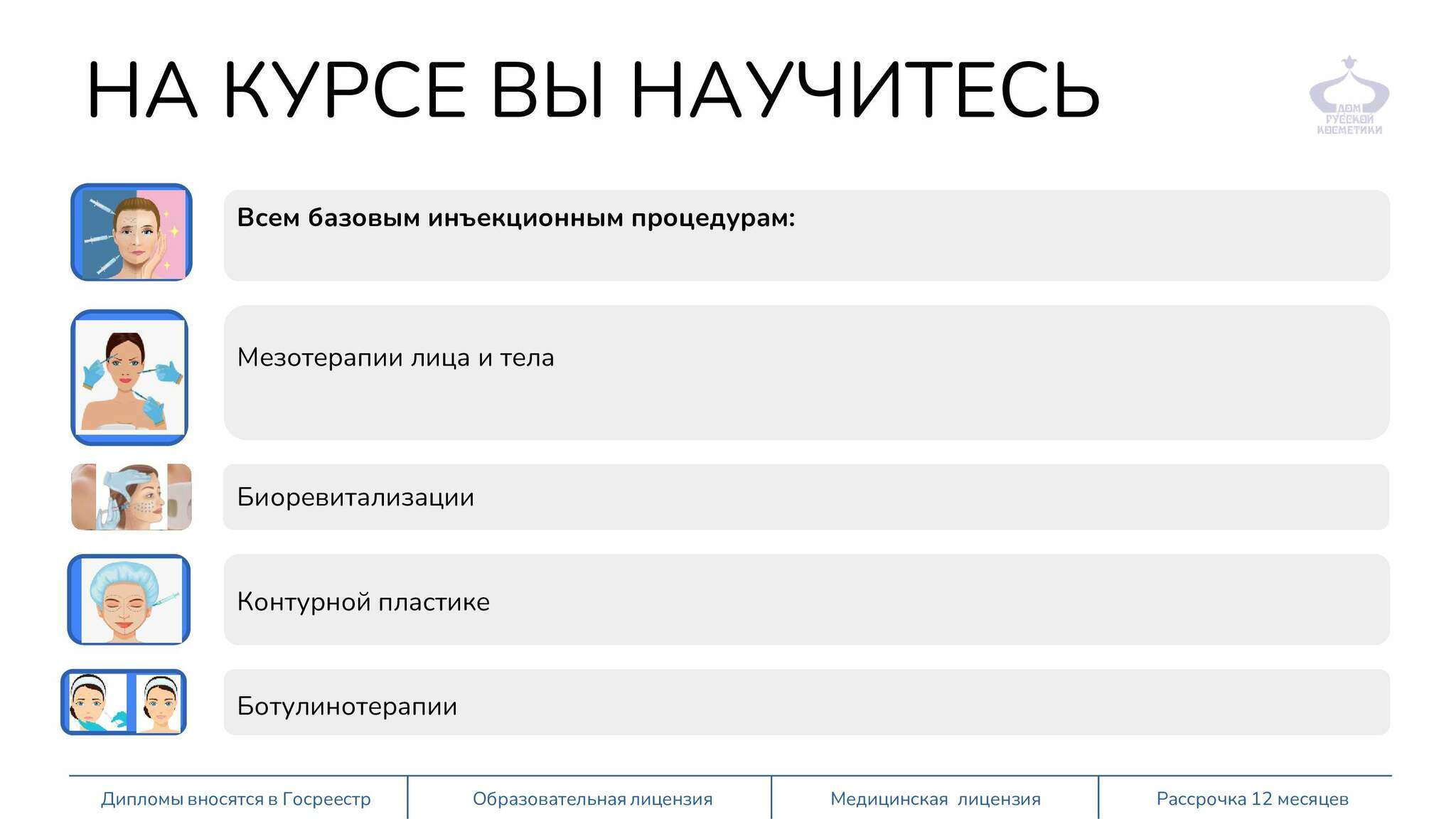 В курс входят: ботулинотерапия, мезотерапия, биоревитализация, контурная пластика