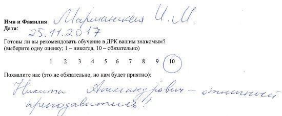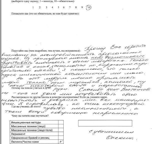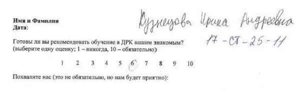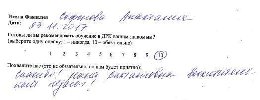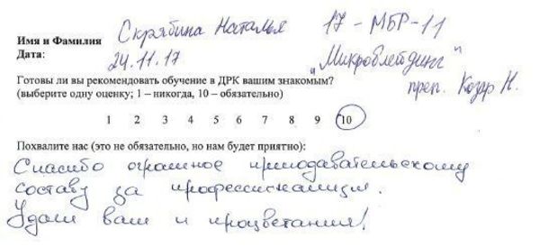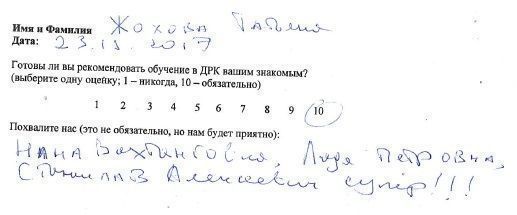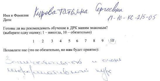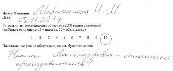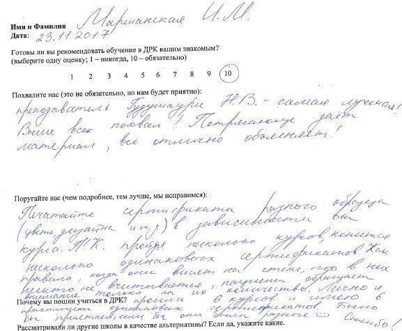 10 баллов. преподаватель Гудушаури Н.В. - самая лучшая! Выше всех похвал! Потрясающе дает материал, все отлично объясняет! Печатайте сертификаты разного образца (цвета, дизайна и т.д) в зависимости от курса. Т.к пройдя несколько курсов, копится несколько одинаковых сертификатов. Как правило, когда они висят на стене, то в них никто не вчитывается, пациент обращает внимание только на их количество. Лично я прошла 6 курсов и имею 6 практически одинаковых сертификатов. Было бы приятней, если бы они были разные :). Спасибо!