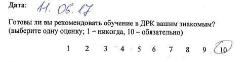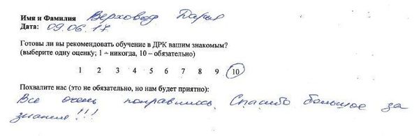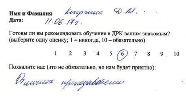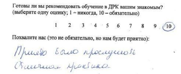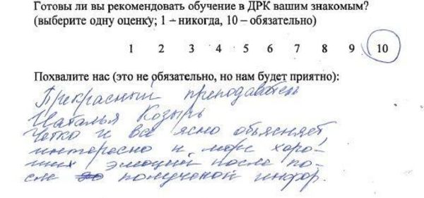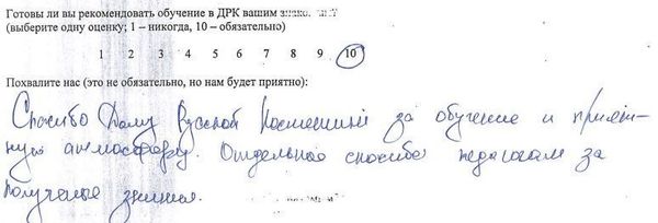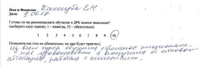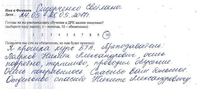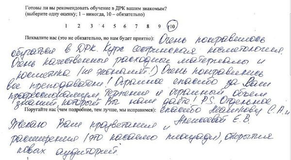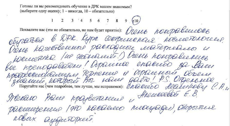 Очень понравилось обучаться в ДРК. Курс Сестринская косметология. Очень качественные расходные материалы и косметика (не экономят!). Очень понравились все преподаватели! Огромное спасибо за Ваш профессионализм, терпение и огромный объем знаний, который Вы нам даете! PS: Отдельное спасибо Машкову С.А. и Алексеевой Е.В. Желаю Вам процветания и расширения (это касаемо площади), открытия новых аудиторий.
