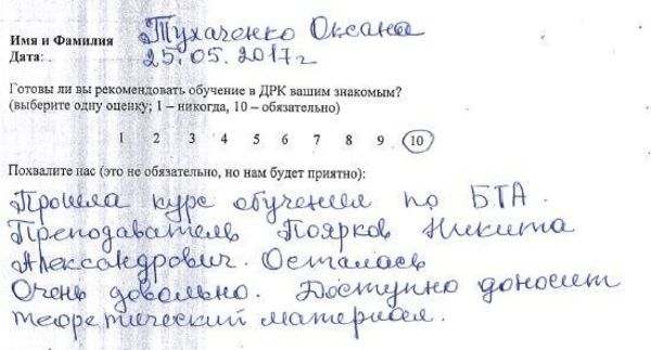 я прошла курс БТА. Преподаватель: Поярков Никита Александрович, очень подробно, терпеливо проводил обучение. Очень понравилось. Спасибо Вам большое. Отдельное спасибо Никите Александровичу.