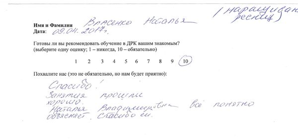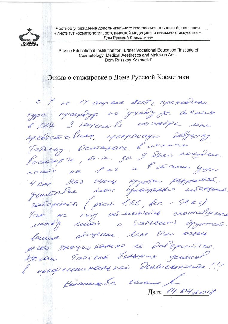 С 4 по 17 апреля 2017г. проходила курс процедур по уходу за телом в ДРК. В качестве стажера мне предоставили прекрасную девушку Татьяну. Осталась в полном восторге, так как за 9 дней похудела почти на 1 кг, и в талии ушло 4 см. Это очень крутой результат, учитывая мои изначально небольшие габариты (рост 1,66, вес – 52 кг.) Так же хочу отметить сложившееся между мной и Татьяной дружественное общение. Мне было очень легко эмоционально ей довериться. Желаю Татьяне больших успехов в профессиональной деятельности!!!