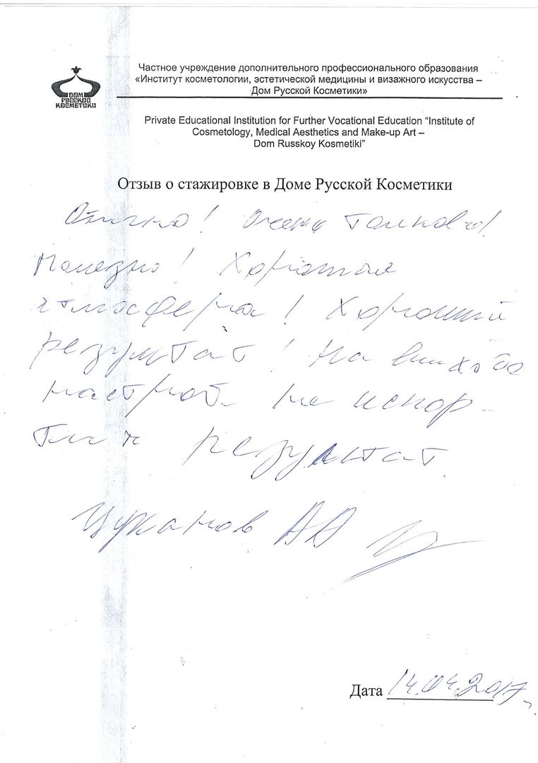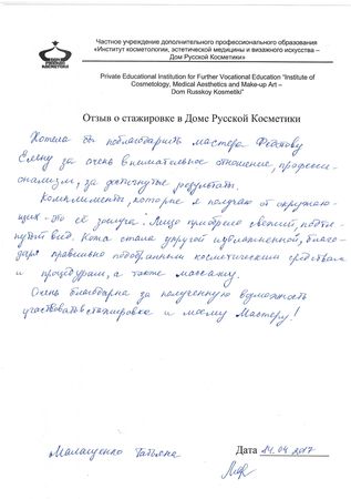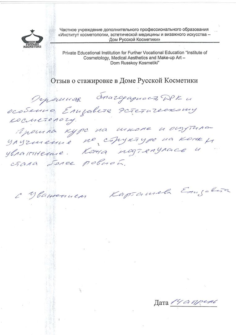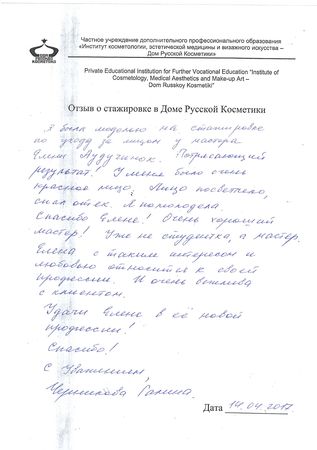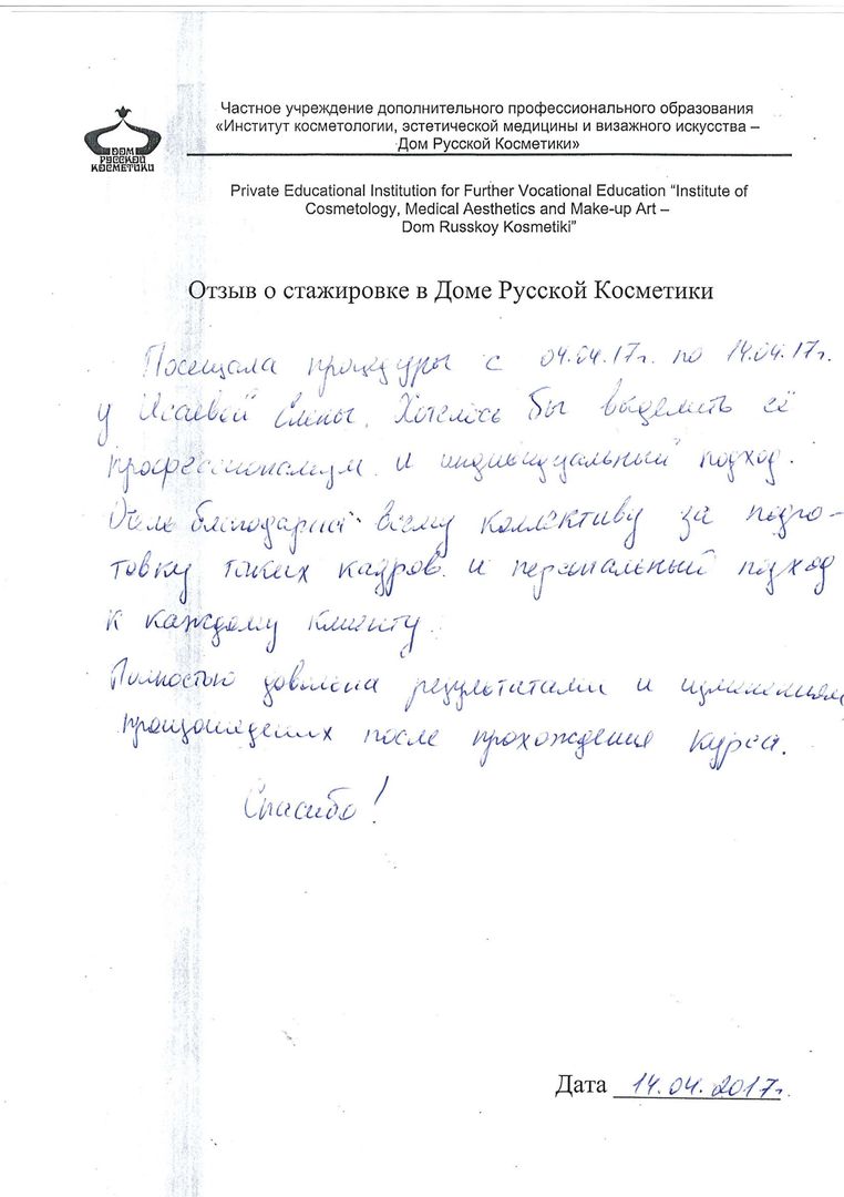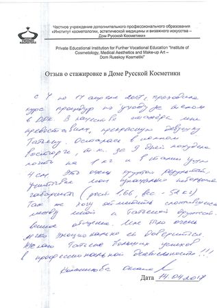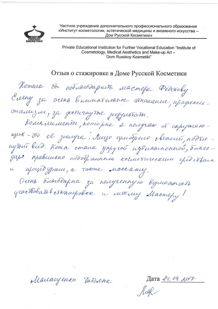 Хотела бы поблагодарить мастера Федотову Елену за очень внимательное отношение, профессионализм, за достигнутые результаты. Комплименты, которые я получаю от окружающих – это её заслуга. Лицо приобрело свежий, подтянутый вид. Кожа стала упругой и увлажненной благодаря правильно подобранным косметическим средствам и процедурам, а также массажу. Очень благодарна за полученную возможность участвовать в стажировке и моему Мастеру!