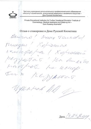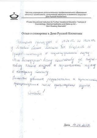 С 24.03 по 14.04.2017г. проходила курс процедур по уходу за лицом. Вместе со стажером Яной проводили курс себорегуляции. При общении чувствовался особый профессионализм и знание предмета деятельности. Связываю это с тем, что она практикующий врач. Результаты процедур очень понравились, лицо посветлело, тургор выровнялся, все воспаления прошли. Очень благодарна Яне за курс процедур и желаю ей удачи в выбранной сфере деятельности.