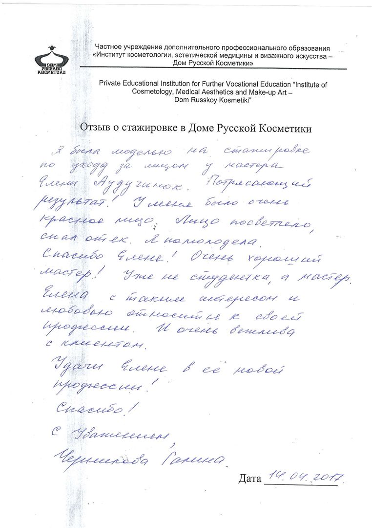 Я была моделью на стажировке по уходу за лицом у мастера Елены Аудучинок. Пострясающий результат! У меня было очень красное лицо. Лицо посветлело, спал отек. Я помолодела. Спасибо Елене! Очень хороший мастер! Уже не студентка, а мастер. Елена с таким интересом и любовью относится к своей профессии. И очень вежлива с клиентом. Удачи Елене в её новой профессии! Спасибо! С уважением, Черникова Галина.