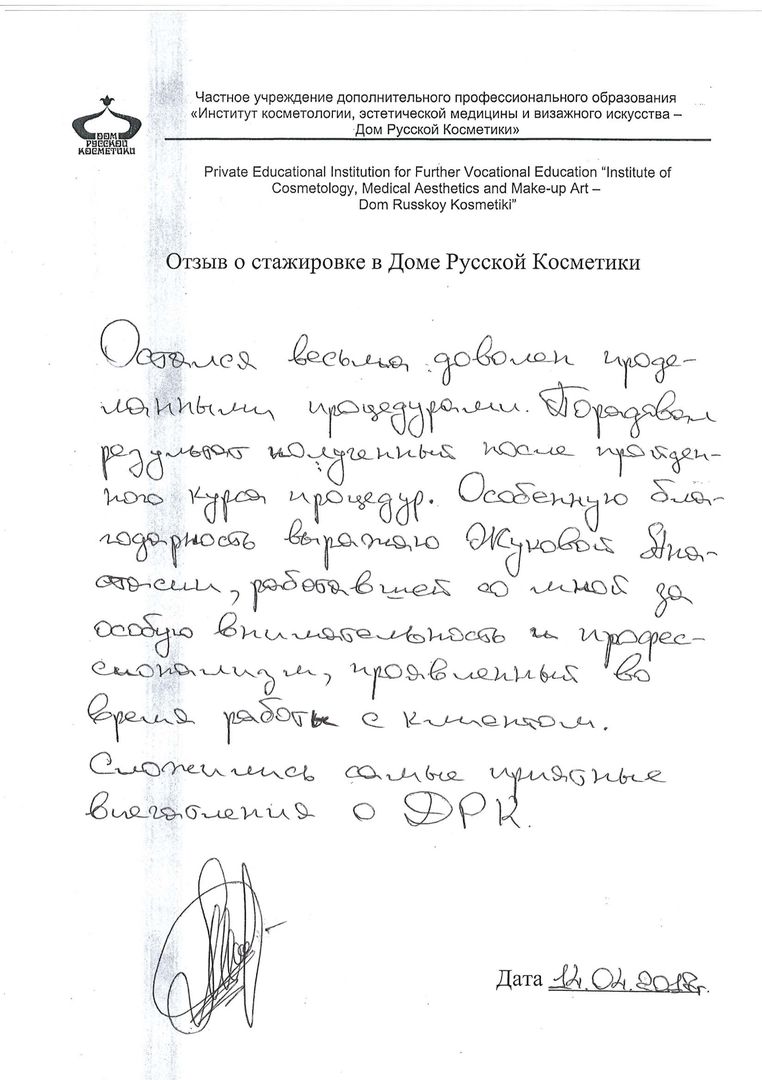 Остался весьма доволен проделанными процедурами. Порадовал результат, полученный после пройденного курса процедур. Особенную благодарность выражаю Жуковой Анастасии, работавшей со мной, за особую внимательность и профессионализм, проявленный во время работы с клиентом. Сложились самые приятные впечатления о ДРК.