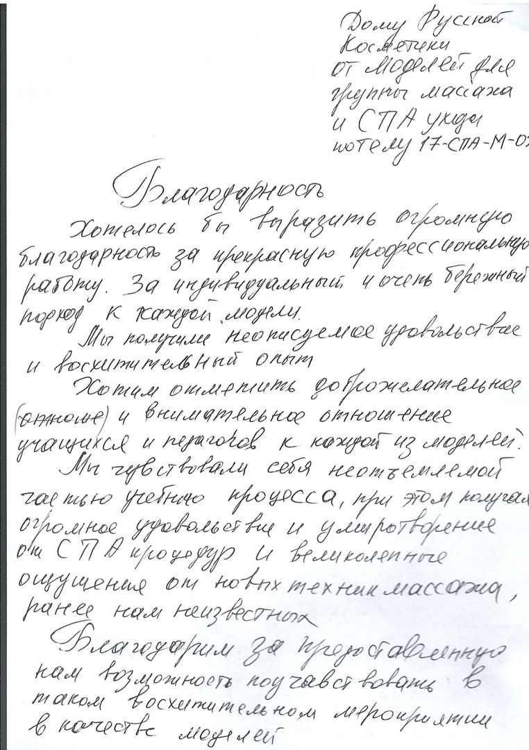 Дому Русской Косметики от Моделей для группы массажа и СПА ухода по телу 17-СПА-М Благодарность. Хотелось бы выразить огромную благодарность за прекрасную профессиональную работу. За индивидуальный и очень бережный подход к каждой модели. Мы получили неописуемое удовольствие и восхитительный опыт. Хотим отметить доброжелательное и внимательное отношение учащихся и педагогов к каждой из моделей. Мы чувствовали себя неотъемлемой частью учебного процесса, при этом получая огромное удовольствие и умиротворение от СПА процедур великолепные ощущения от новых техник массажа, ранее нам неизвестных. Благодарим за предоставленную нам возможность поучаствовать в таком восхитительном мероприятии в качестве моделей.