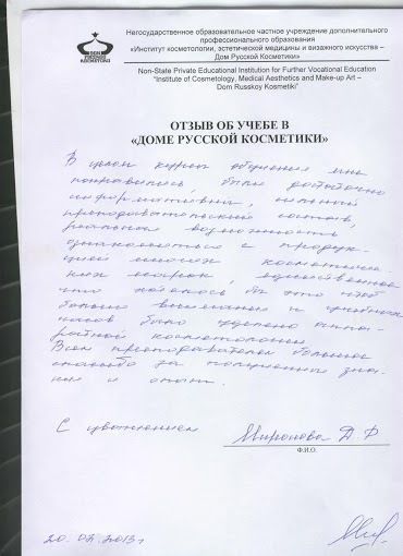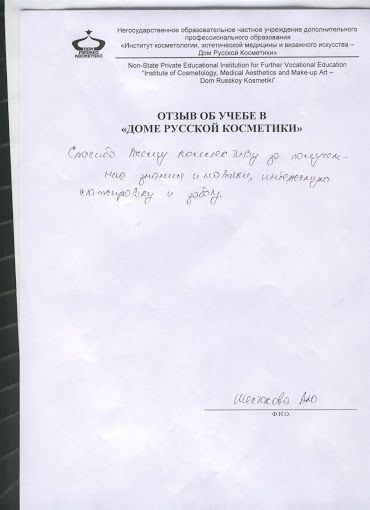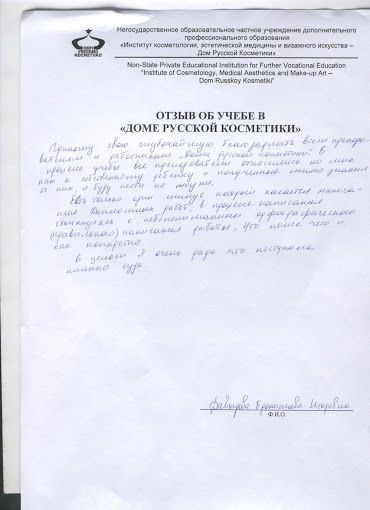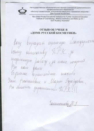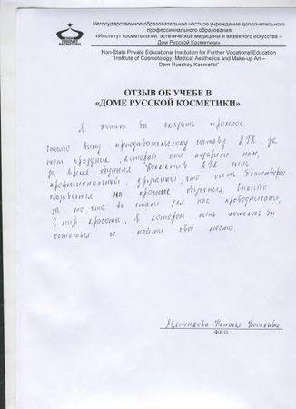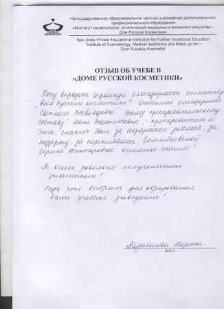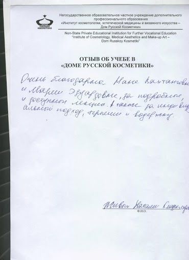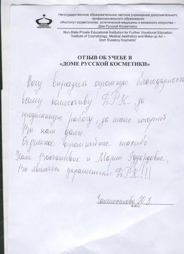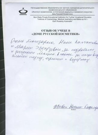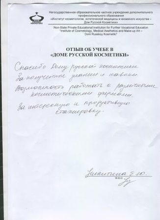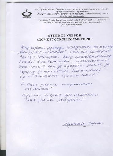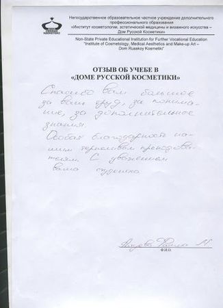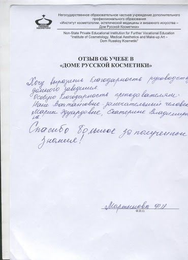 Приношу свою глубочайшую благодарность всем преподавателям и работникам «Дома Русской Косметики». В процессе учебы все преподаватели относились ко мне как к собственному ребенку, и полученные мною знания от них я буду нести по жизни. Есть только один минус, который касается написания дипломных работ. В процессе написания столкнулась с недопониманием орфографического (правильного) написания работы. Что после чего, и как конкретно. В целом, я очень рада, что поступила именно сюда.