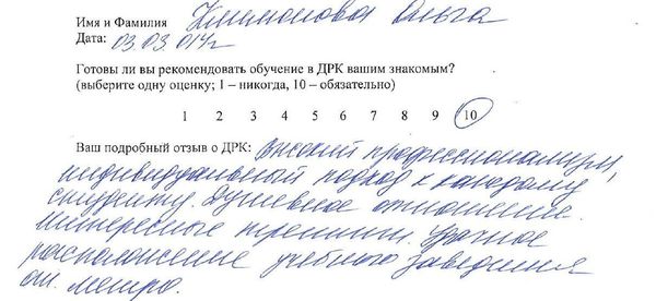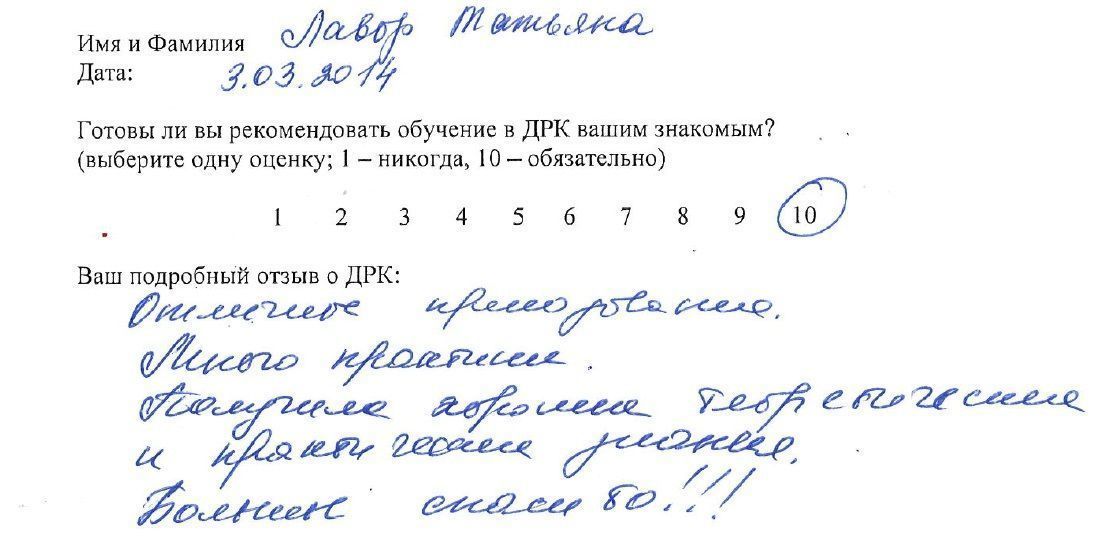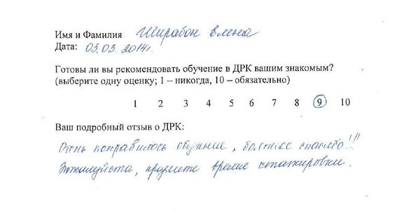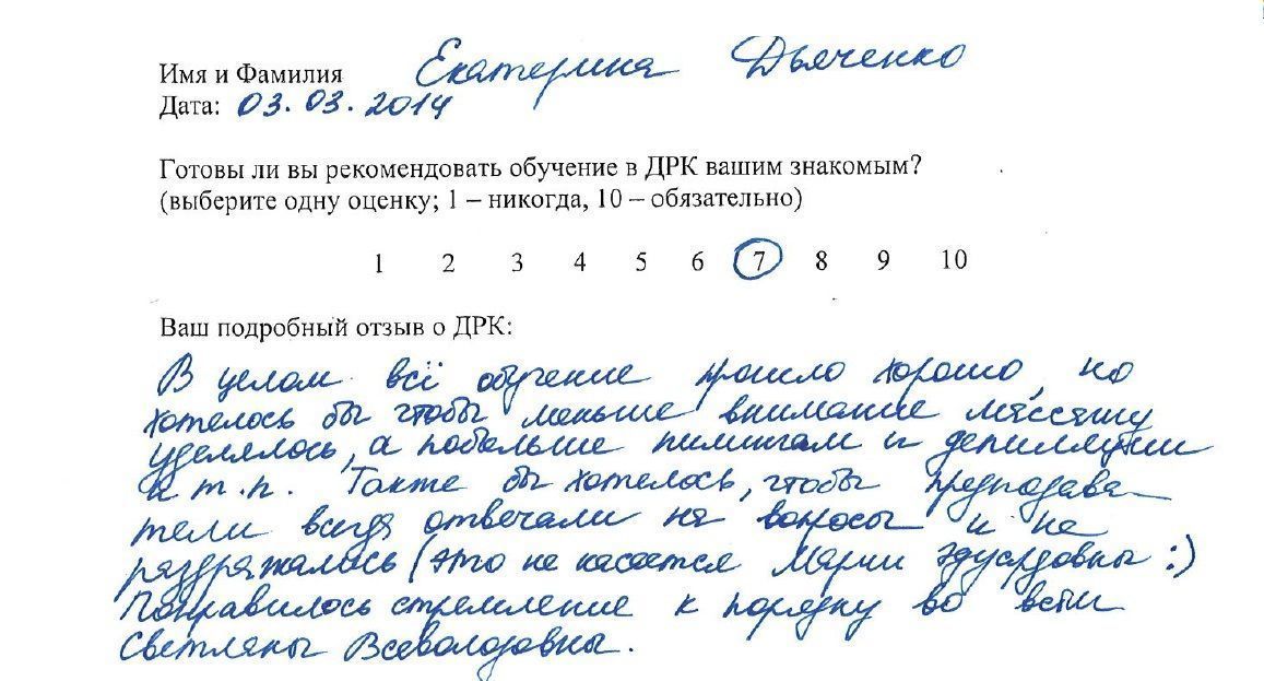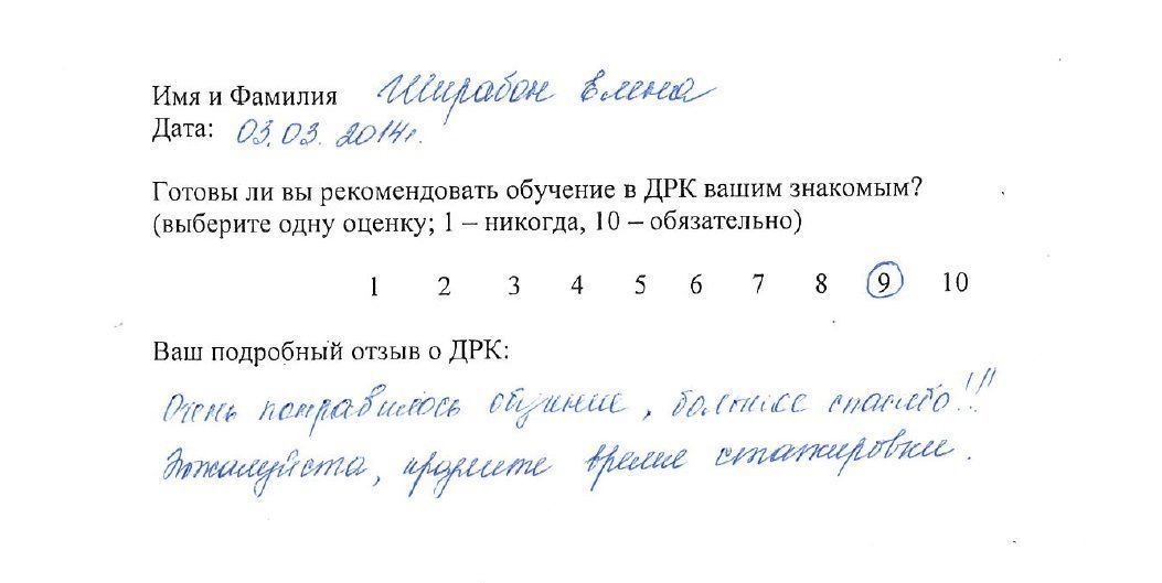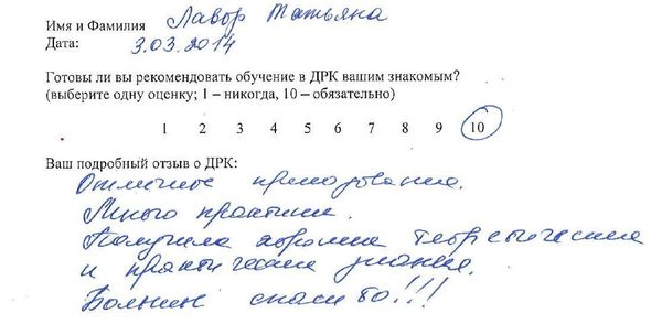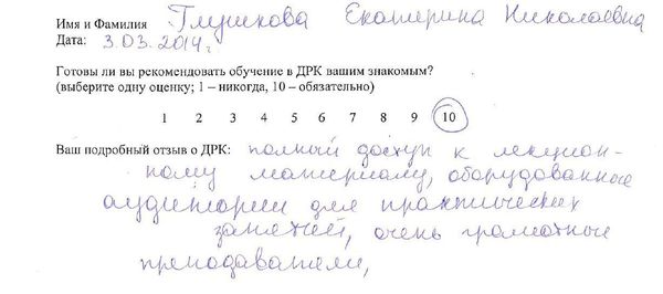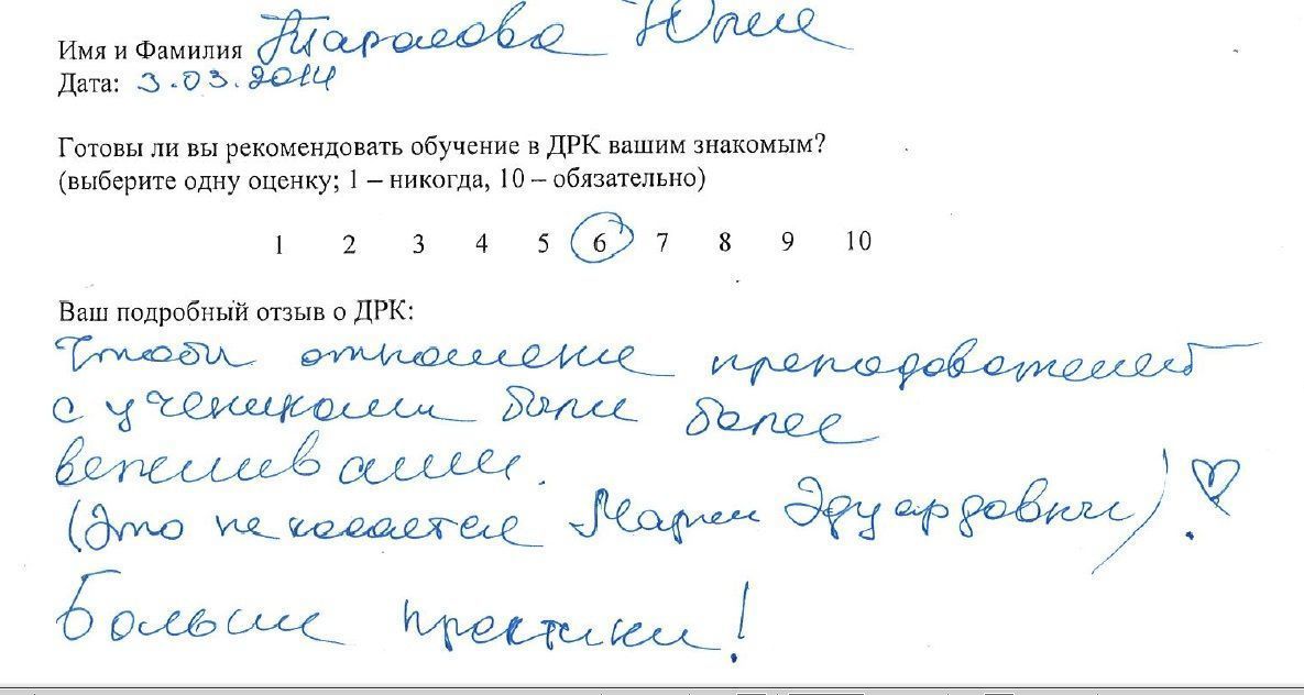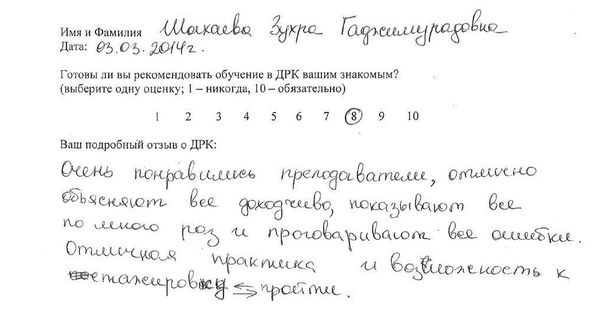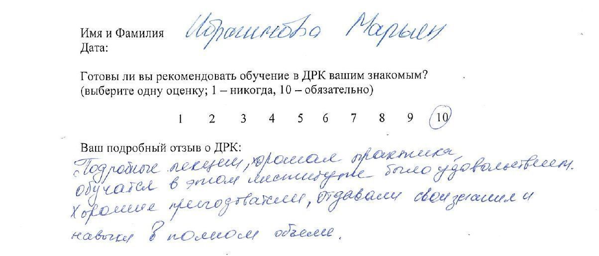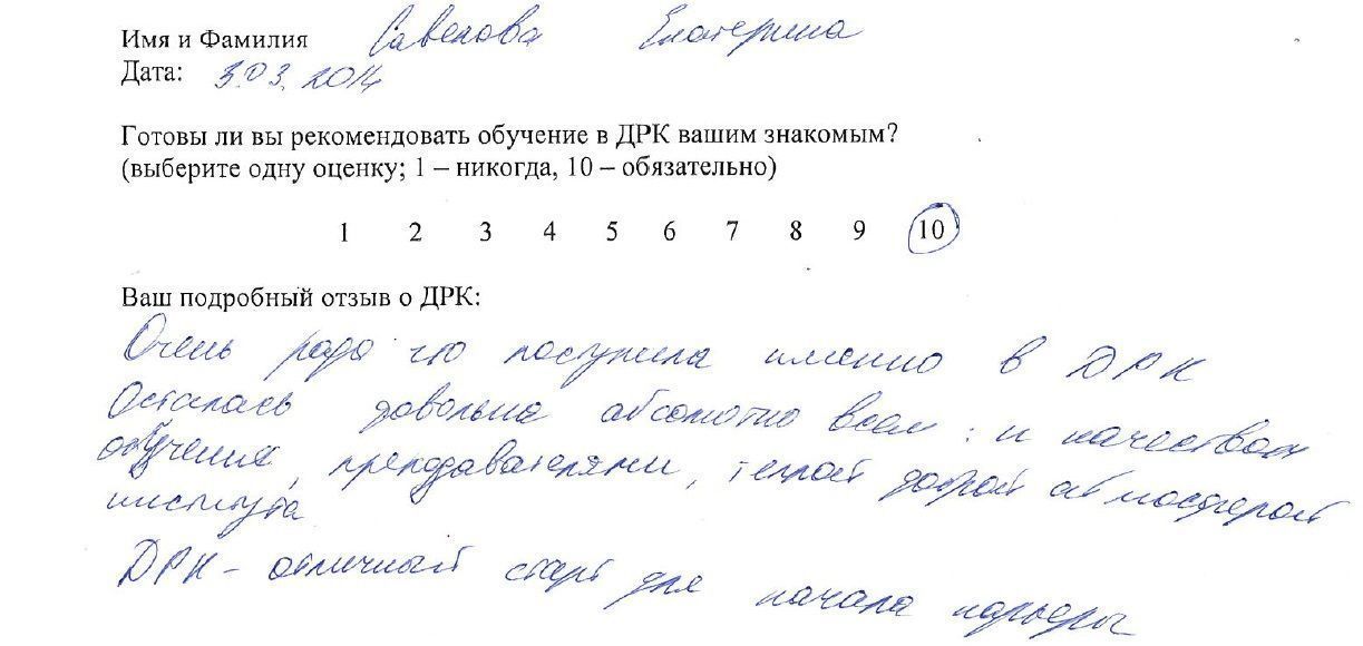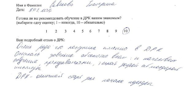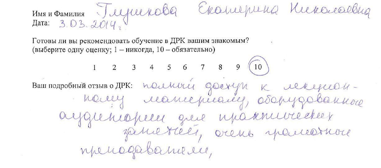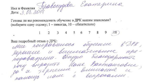 Мне понравилось обучение в ДРК, хорошие и внимательные преподаватели. Общую благодарность хочу выразить Нане Вахтанговне за ее терпение, внимание и помощь нам с вопросами.