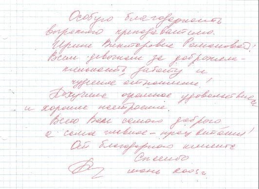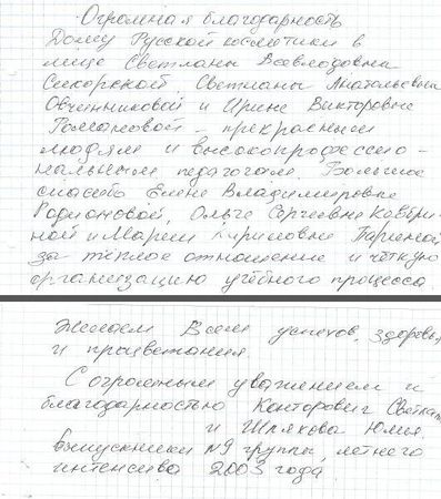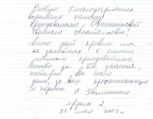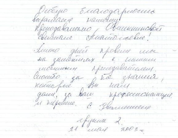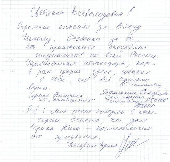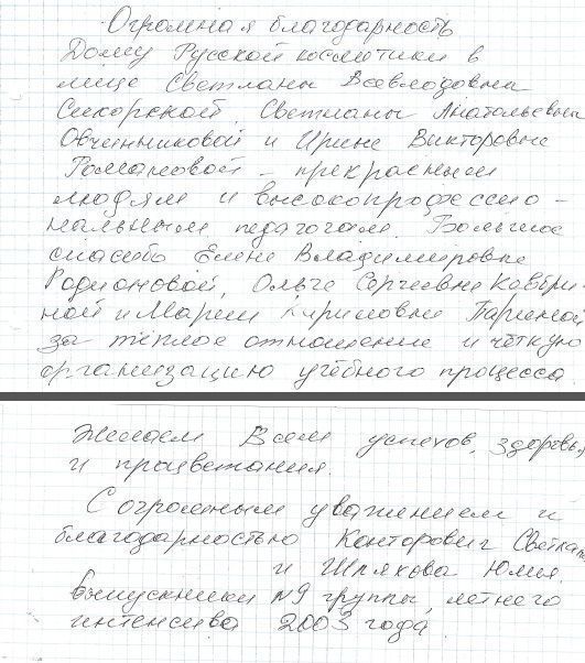 Огромная благодарность Дому Русской косметики в лице Светланы Всеволодовны Сикорской, Светланы Анатольевны Овчинниковой и Ирине Викторовне Романовой — прекрасным людям и высркопрофессиональным педагогам. Большое спасибо Елене Владимировне Родионовой, Ольге Сергеевна Ковбриной и Марии Кириловне Париной за теплое отношение и четкую организацию учебного процесса. Желаем Вам успехов, здоровья и процветания. С огромным уважением и благодарнотью, Конторович Светлана и Шляхова Юлия, выпускники группы №9, летнего интенсива 2003г.