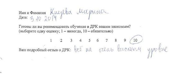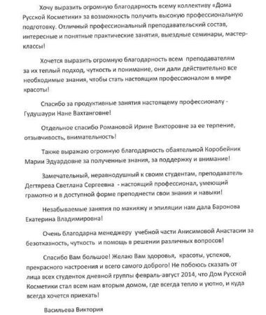 Хочу выразить огромную благодарность всему коллективу «Дома Русской Косметики» за возможность получить высокую профессиональную подготовку. Отличный профессиональный преподавательский состав, интересные и понятные практические занятия, выездные семинары, мастер классы! Хочется выразить огромную благодарность всем преподавателям за их теплый подход, чуткость и понимание, они дали действительно все необходимые знания, чтобы стать настоящим профессионалом в мире красоты! Спасибо за продуктивные занятия настоящему профессионалу — Гудушаури Нане Вахтанговне! Отдельное спасибо Романовой Ирине Викторовне за ее терпение, отзывчивость, внимательность! Также выражаю огромную благодарность обаятельной Корабейник Марии Эдуардовне за полученные знания, за поддержку и внимание! Замечательный, неравнодушный к своим студентам преподаватель Дегтярева Светлана Сергеевна — настоящий профессионал, умеющий грамотно и в доступной форме преподнести свои знания и навыки! Незабываемые занятия по макияжу и эпиляции нам дала Боронова Екатерина Владимировна! Очень благодарна менеджеру учебной части Анисимовой Анастасии за безотказность, чуткость и помощь в решении различных вопросов! Спасибо Вам большое! Желаю Вам здоровья, красоты, успехов, прекрасного настроения и всего самого доброго! Не побоюсь сказать от лица всех студенток дневной группы февраль-август 2014, что Дом Русской Косметики стал всем нам вторым домом, где всегда тепло и уютно, и куда всегда хочется приехать!