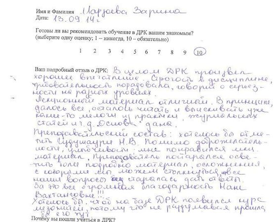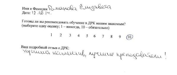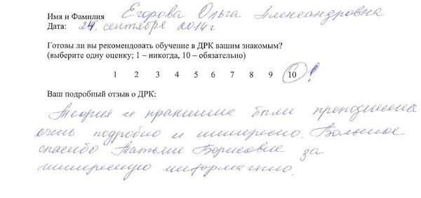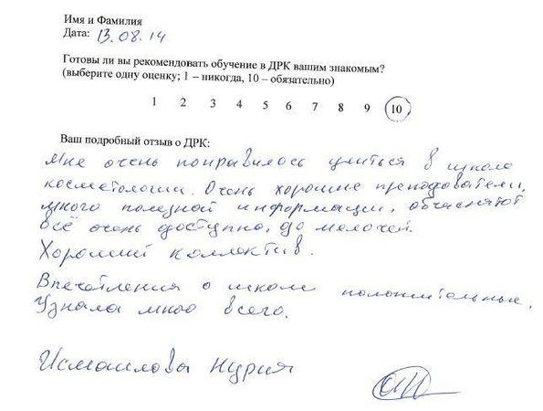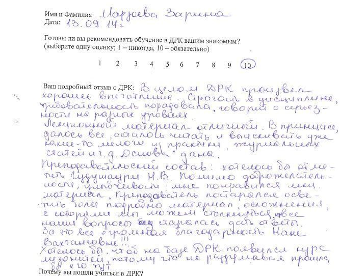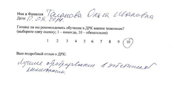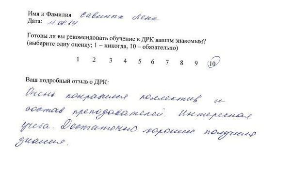 В целом ДРК произвел хорошее впечатление. Строгость в дисциплине, требовательность порадовала, говорит о серьезности на разных уровнях. Лекционный материал отличный. В принципе, далось все, осталось читать и выискивать уже какие-то мелочи из практики, журнальных статей и т. д. «Основа» дана. Преподавательский состав: хотелось бы отметить Гудушаури Н.В. Помимо доброжелательности, улыбчивости: мне понравился лекционный материал. Преподаватель постарался осветить более подробно материал, осложнения, с которыми мы можем столкнуться, на все наши вопросы старалась дать ответы. За это все огромная благодарность Нане Вахтанговне!!! Хотелось бы, чтоб на базе ДРК появился курс мезонитей, потому что не раздумывая прошла бы его тут.