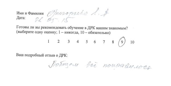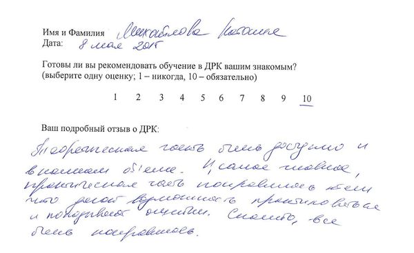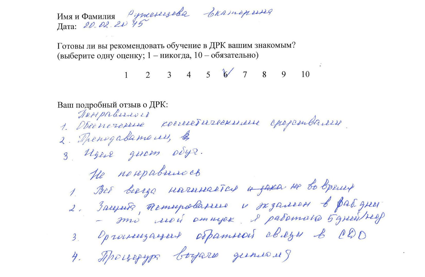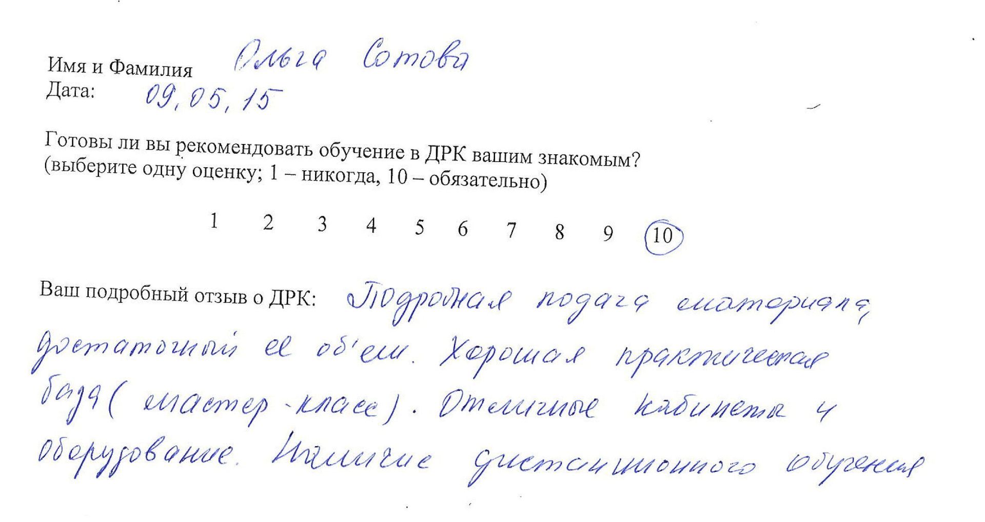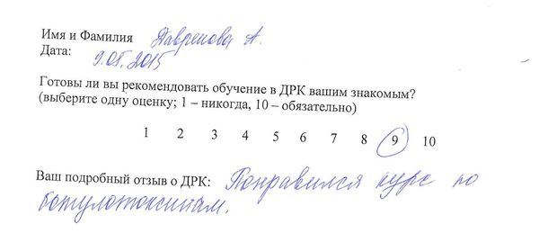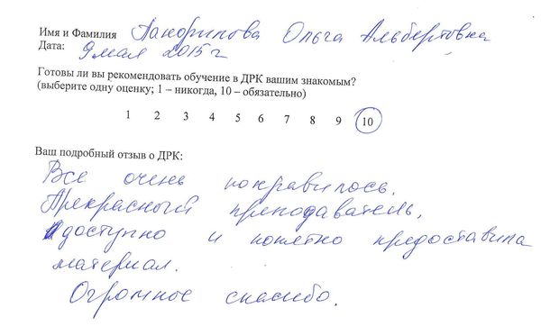 Курсы очень насыщенные, уровень высокий, теория достаточно <неразборчиво> и большая по объему, учиться сложно, но интересно, узнал очень много нового. Особенно хотелось отметить преподавателя Есакову Е.Б. – очень компетентная, четкое преподавание, грамотная, по практике – четкий план, разные методики и средства, реально научились на практике.