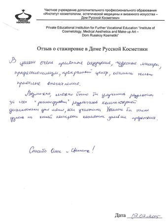 Теоретическая часть насыщенная, подробная. Все преподаватели проявляли большое терпение, на занятиях отвечали на все возникающие вопросы. Очень понравилась практика, под руководством Исаковой Елены Борисовны, уходовая программа практики очень насыщенная, с ежедневным повторением всего пройденного материала. Что для меня очень важно! Отдельно благодарна менеджеру Ольге и Кристине за оперативное решение возникающих вопросов и участия!