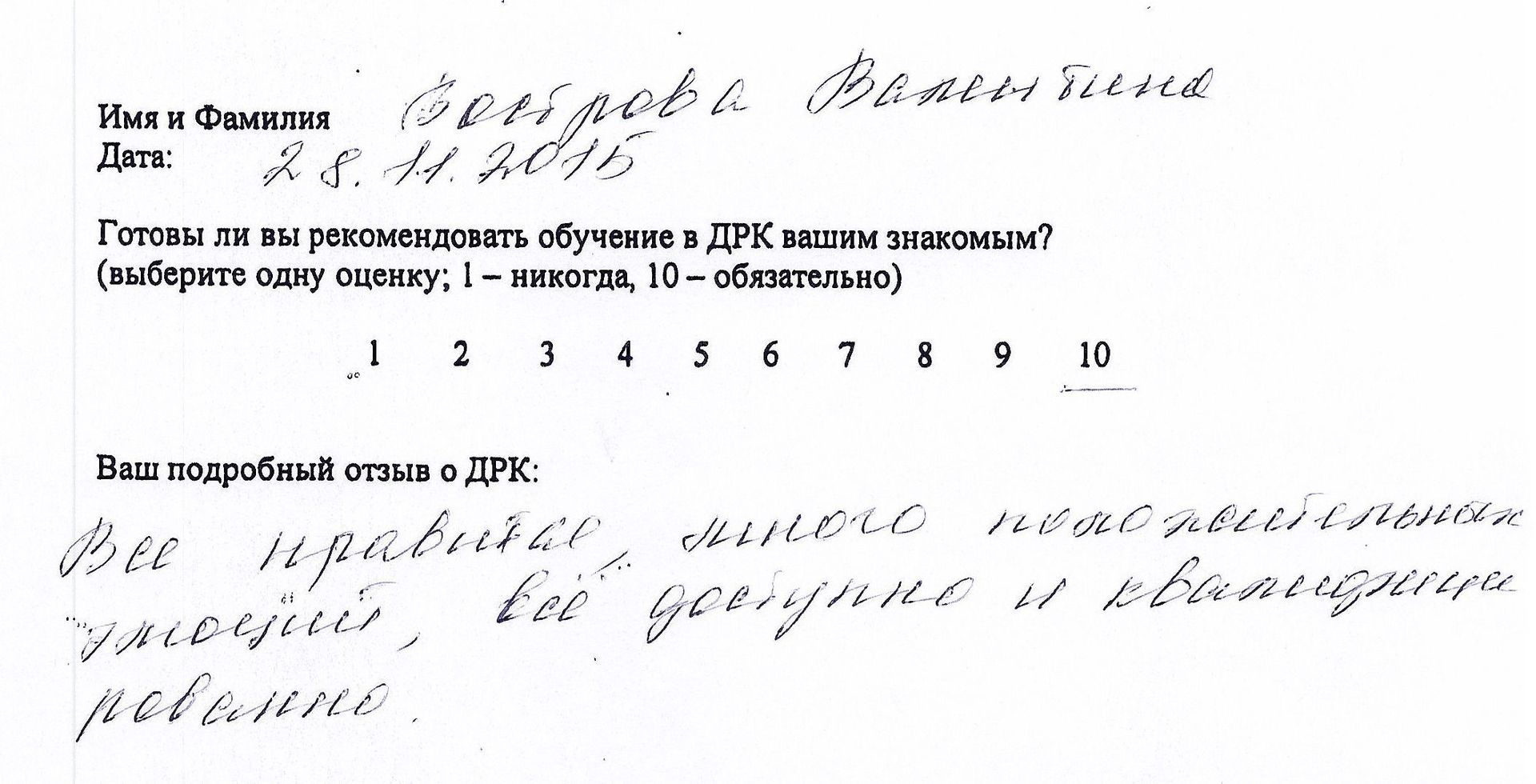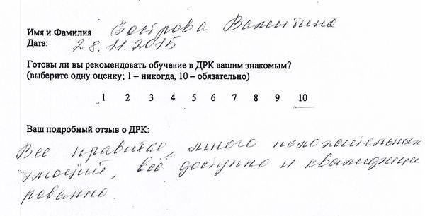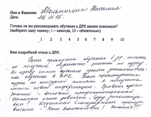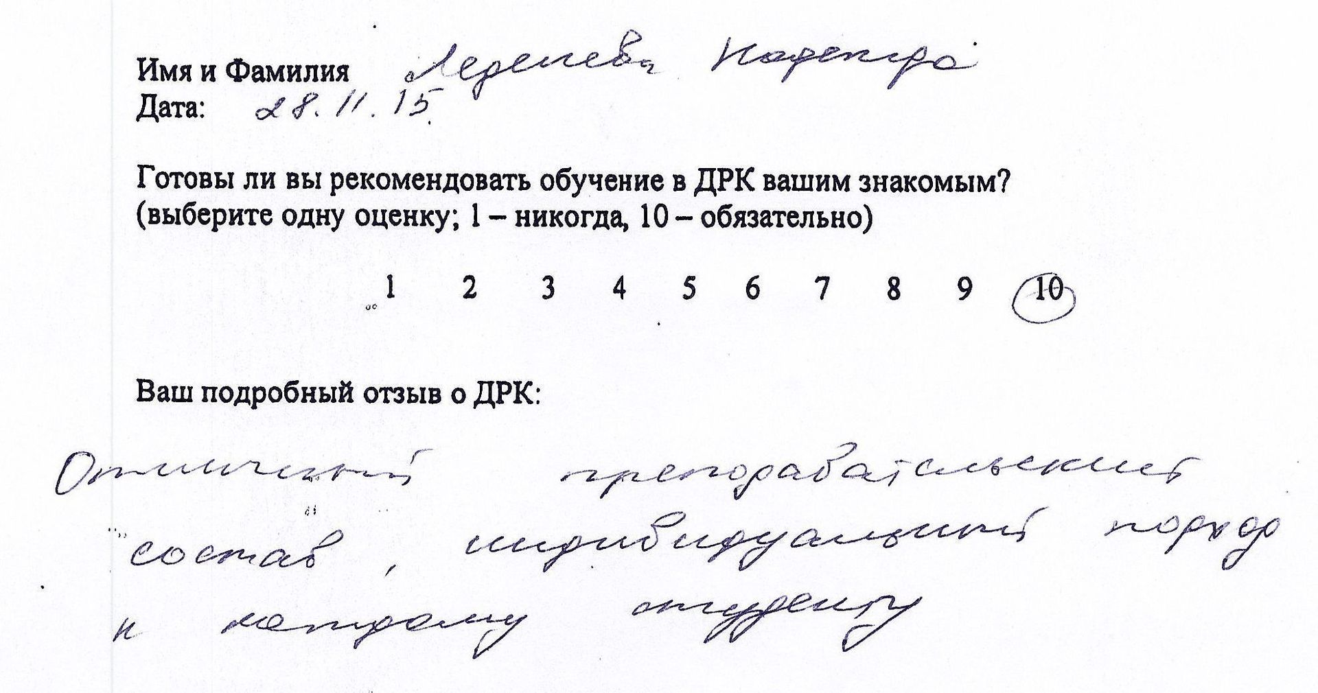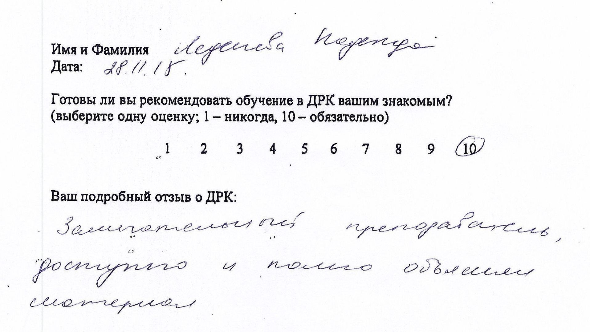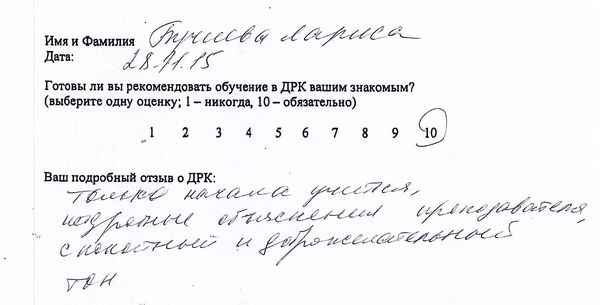 Ранее проходила обучение в др. школах, но получала недостаточно знаний по курсу. По отзыву коллег пришла пройти дополнительное обучение в ДРК. После прохождения курса по контурной пластике я получила много новой информации. Уровень подачи знаний — высокий, профессиональный. Осталась очень довольна, буду рекомендовать! Отдельная благодарность преподавателю Нане Вахтанговне! Спасибо!!!