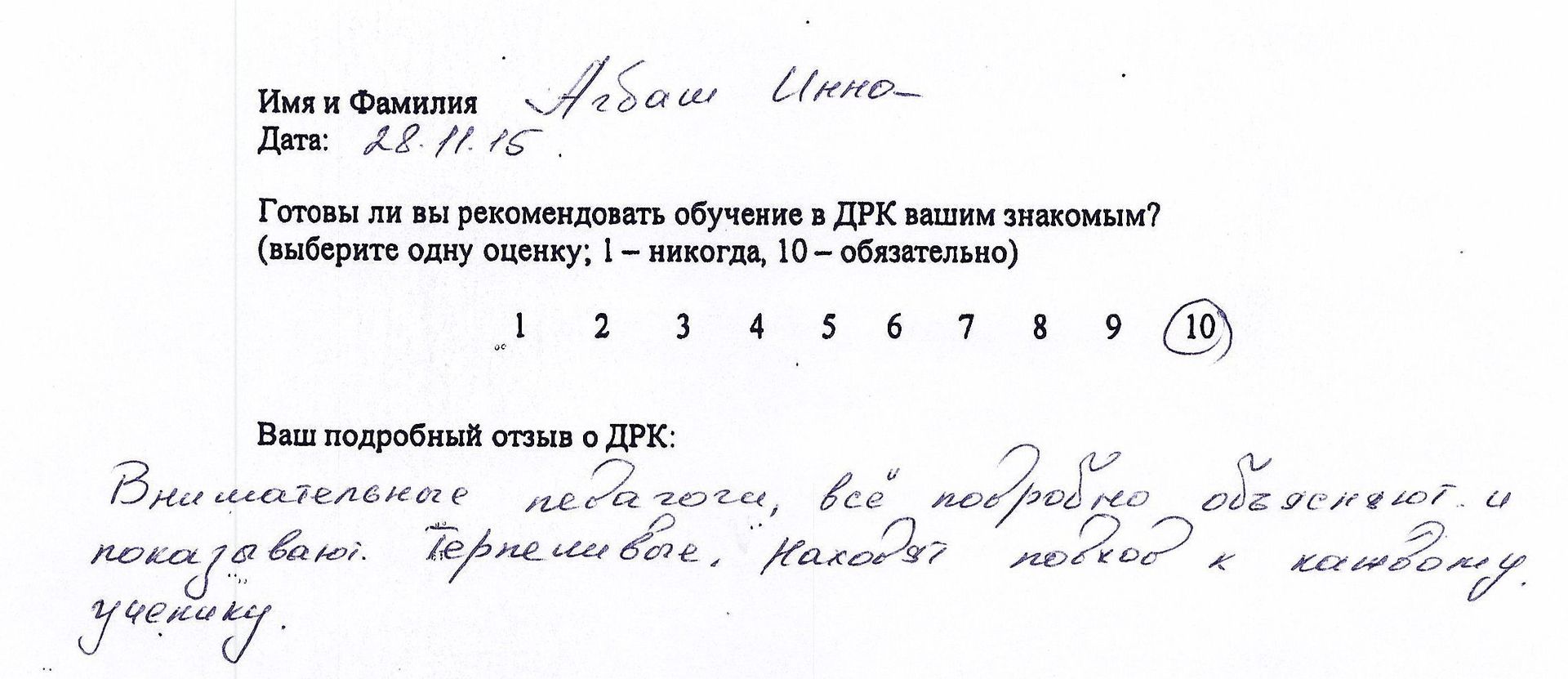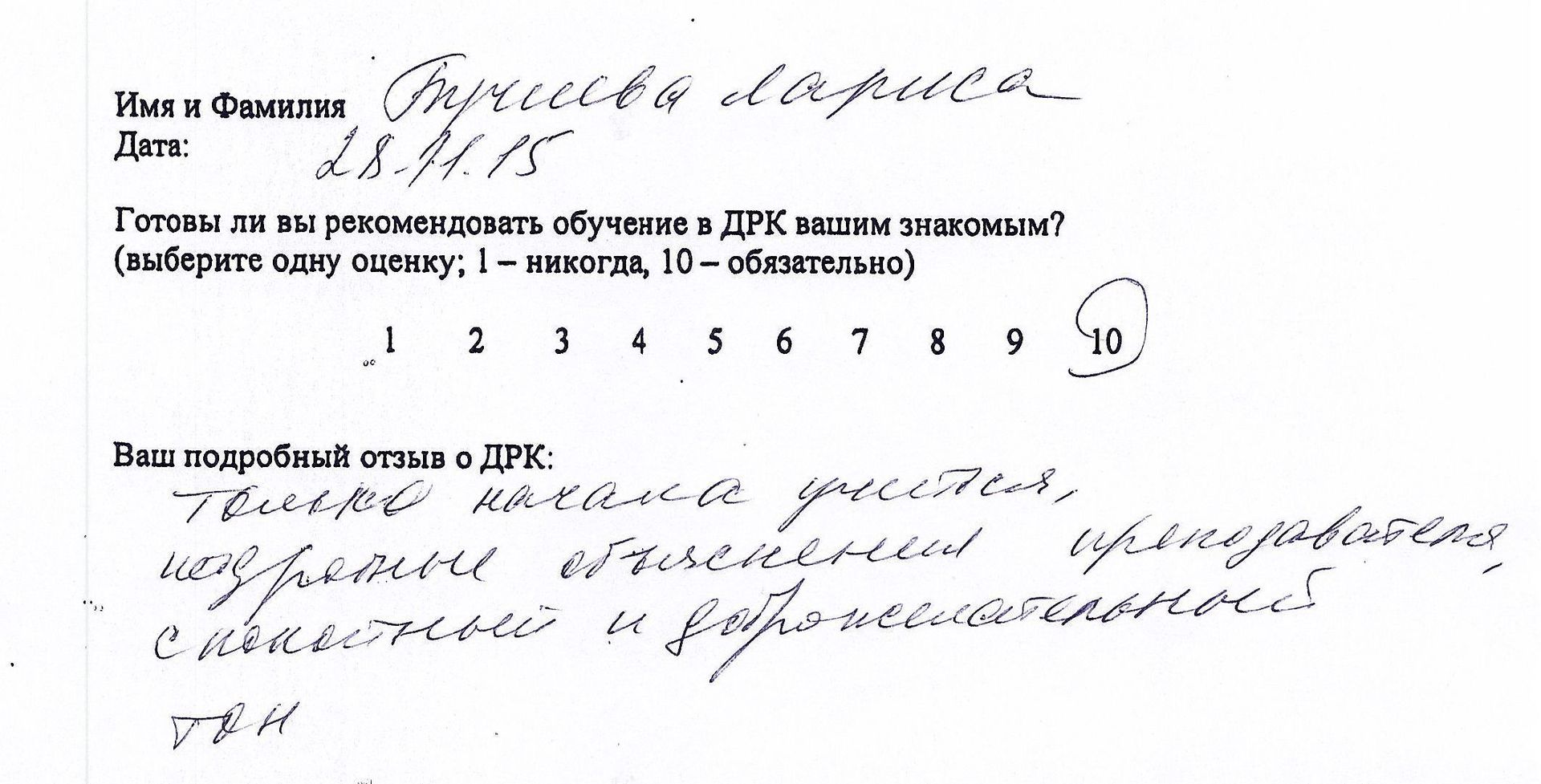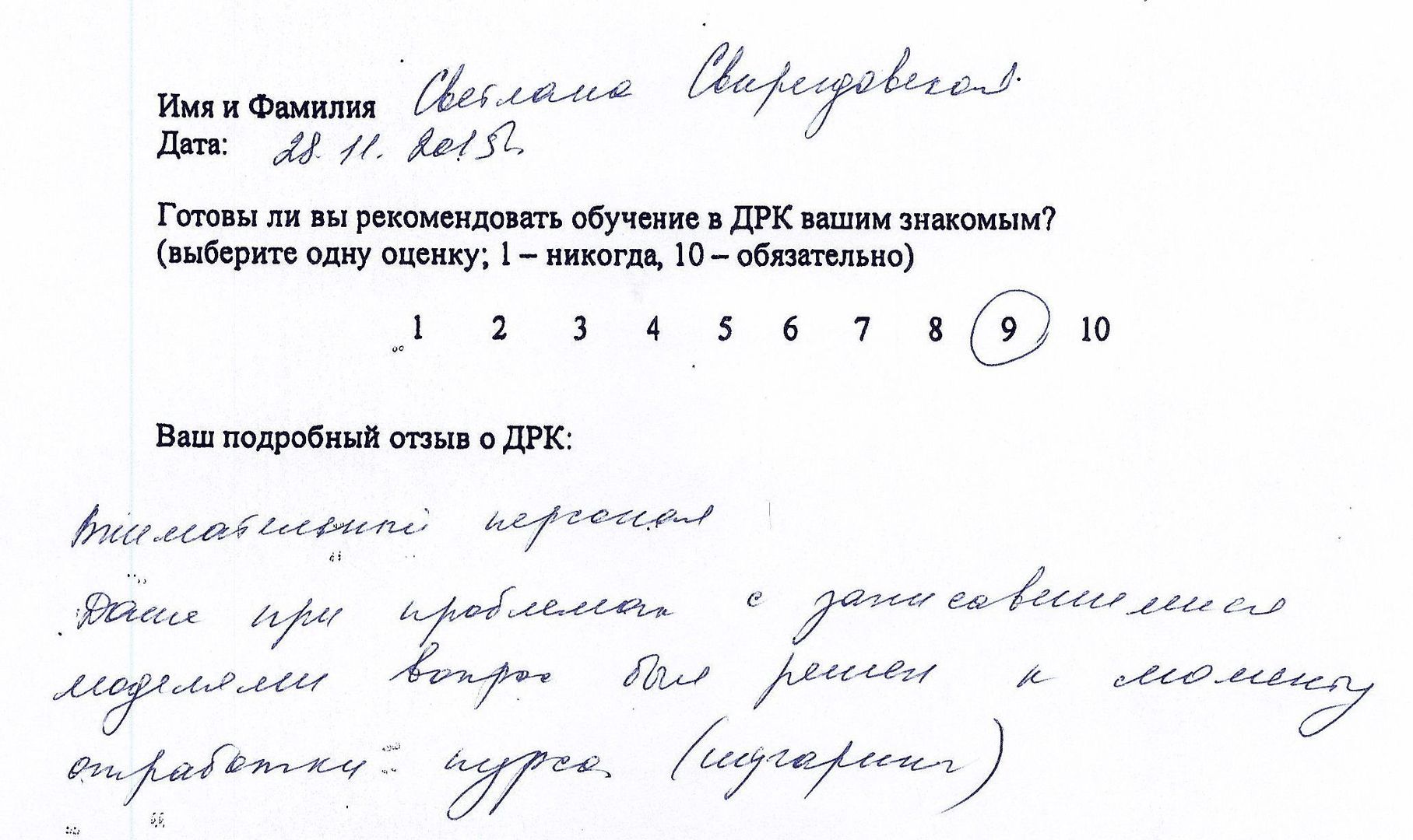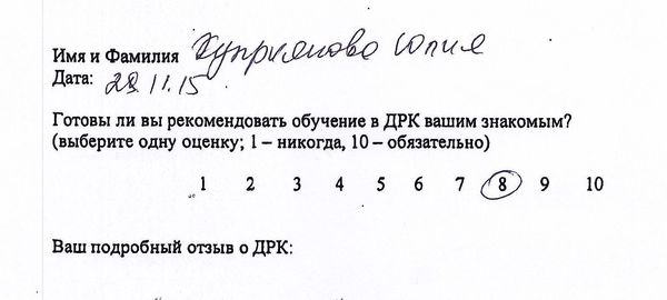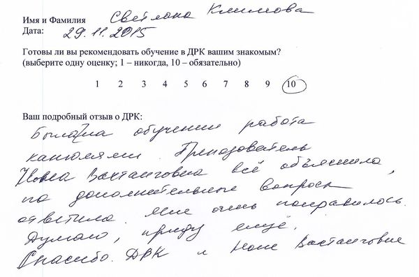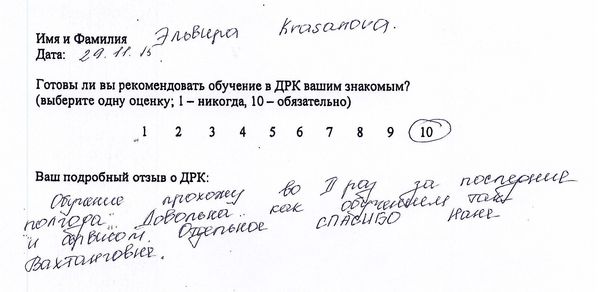 Ранее проходила обучение в др. школах, но получала недостаточно знаний по курсу. По отзыву коллег пришла пройти дополнительное обучение в ДРК. После прохождения курса по контурной пластике я получила много новой информации. Уровень подачи знаний — высокий, профессиональный. Осталась очень довольна, буду рекомендовать! Отдельная благодарность преподавателю Нане Вахтанговне! Спасибо!!!