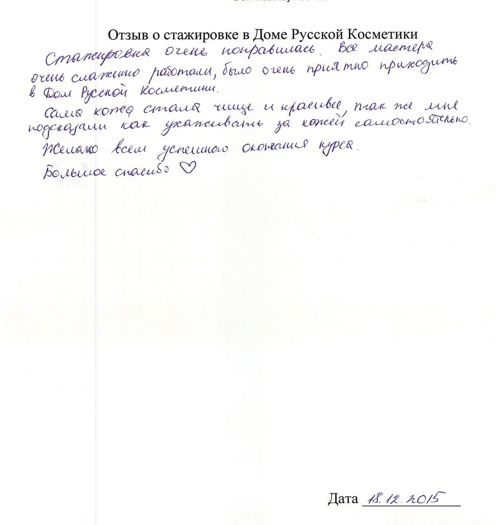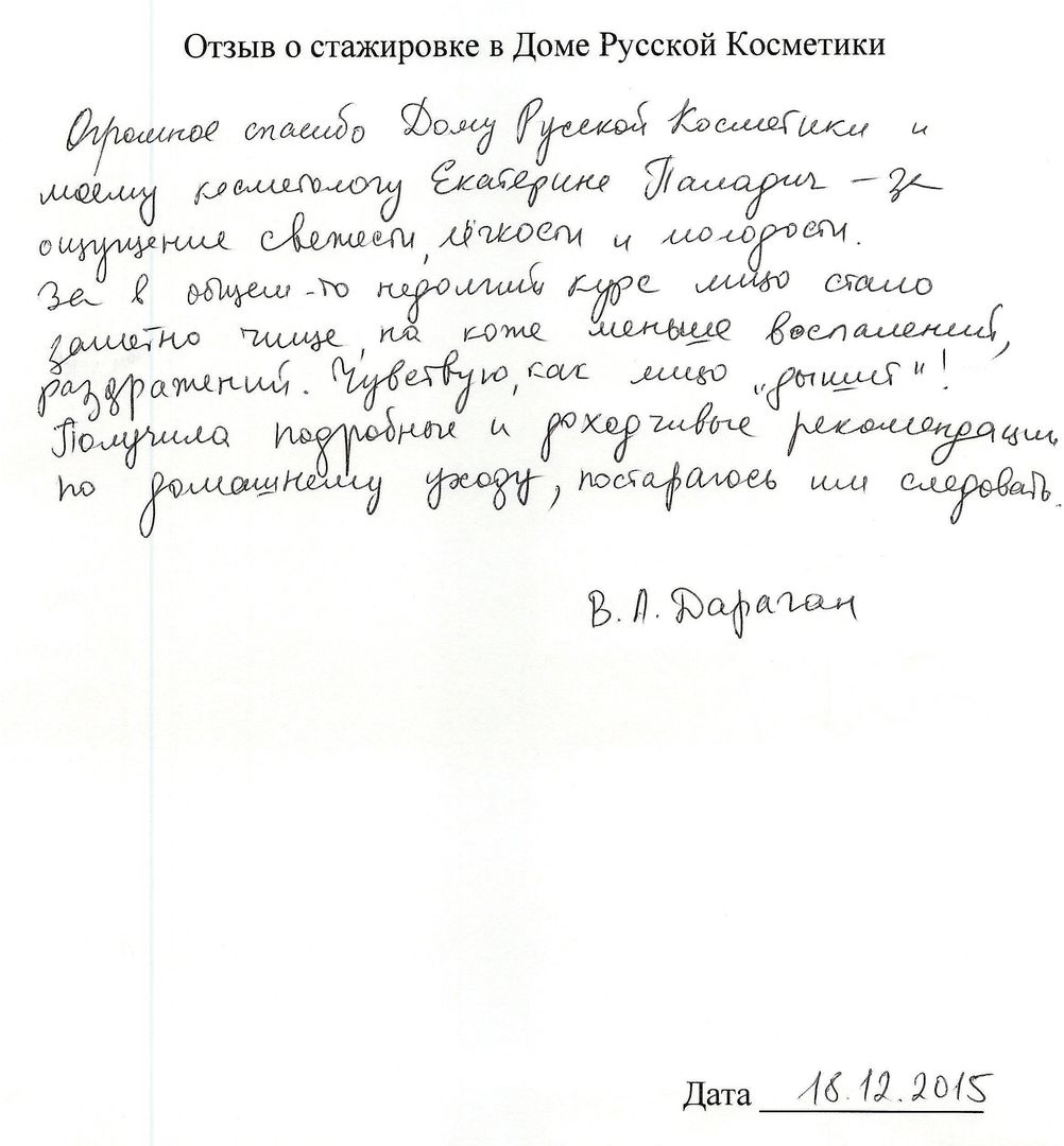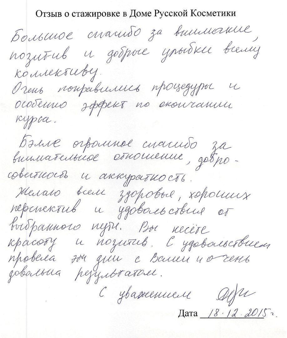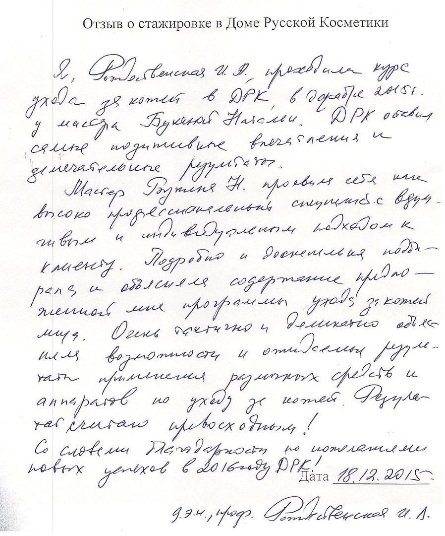 Отзыв о стажировке в Доме Русской Косметики я, Рождественская И.А., проходила курс ухода за кожей в ДРК, в декабре 2015 у мастера Букиной Натальи. ДРК оставил самые позитивные впечатления и замечательные результаты. Мастер Букина Н. проявила себя как высоко профессиональный специалист с вдумчивым и индивидуальным подходом к клиенту. Подробно и <неразборчиво> подобрала и объяснила содержание предложенной мне программы ухода за кожей лица. Очень тактично и деликатно объяснила возможности и отдельные результаты применения различных средств и аппаратов по уходу за кожей. Результат считаю превосходным! Со словами благодарности <неразборчиво> пожеланиями новых успехов в 2016 году ДРК!