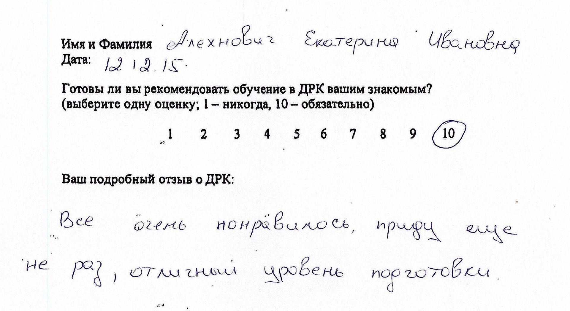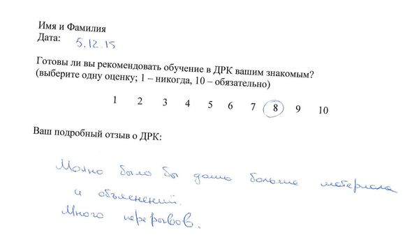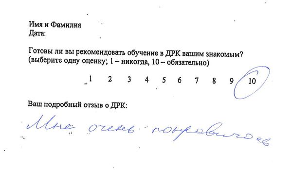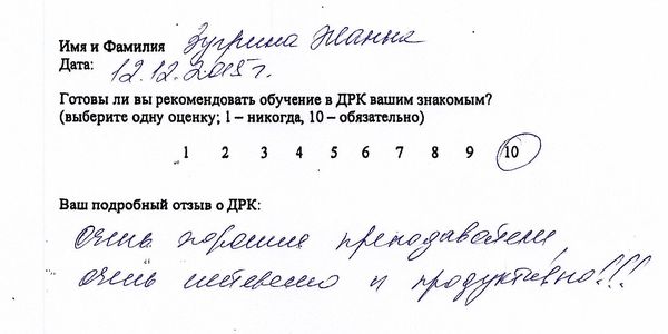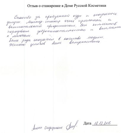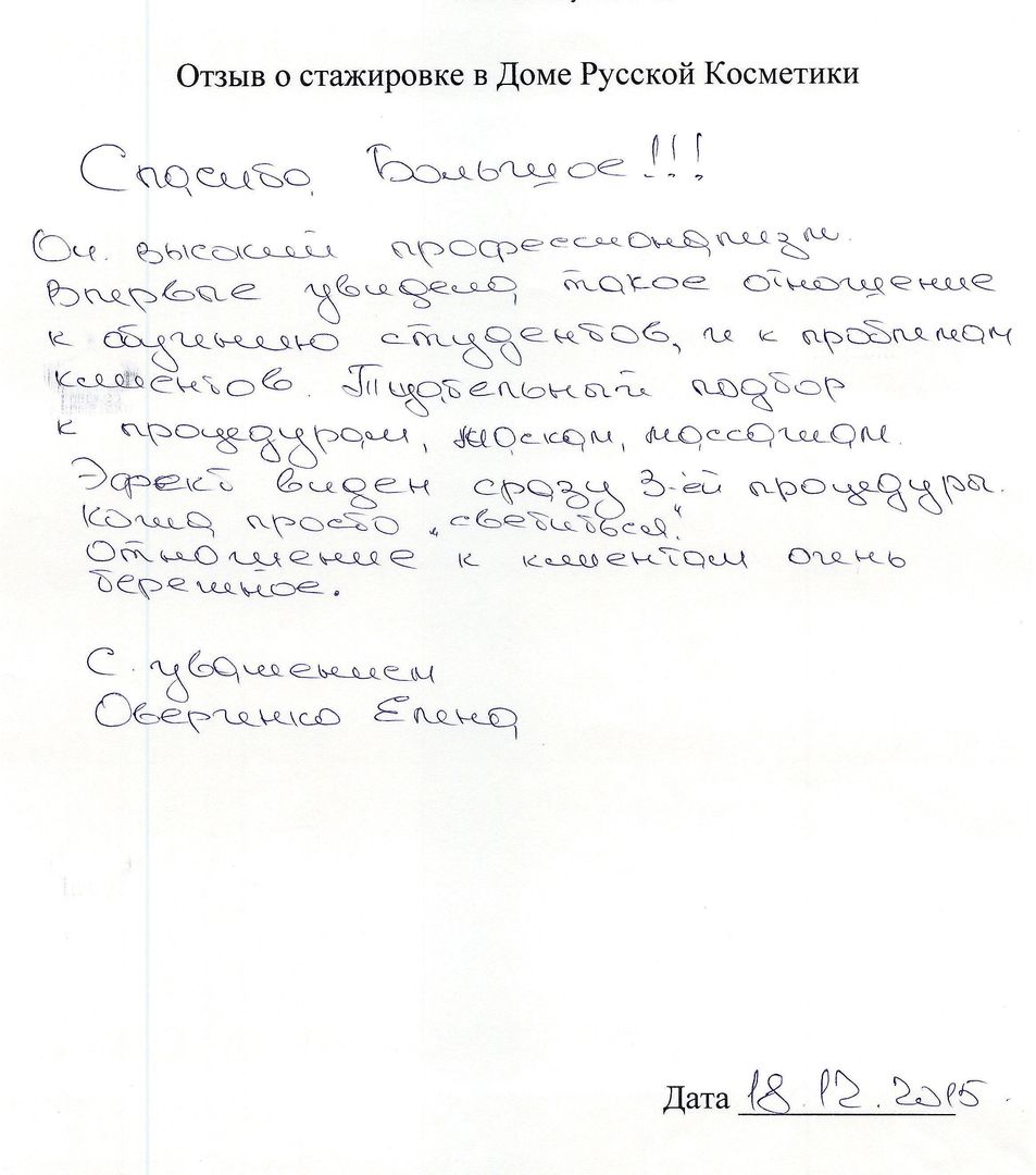 Отзыв о стажировке в Доме Русской Косметики я, Рождественская И.А., проходила курс ухода за кожей в ДРК, в декабре 2015 у мастера Букиной Натальи. ДРК оставил самые позитивные впечатления и замечательные результаты. Мастер Букина Н. проявила себя как высоко профессиональный специалист с вдумчивым и индивидуальным подходом к клиенту. Подробно и <неразборчиво> подобрала и объяснила содержание предложенной мне программы ухода за кожей лица. Очень тактично и деликатно объяснила возможности и отдельные результаты применения различных средств и аппаратов по уходу за кожей. Результат считаю превосходным! Со словами благодарности <неразборчиво> пожеланиями новых успехов в 2016 году ДРК!