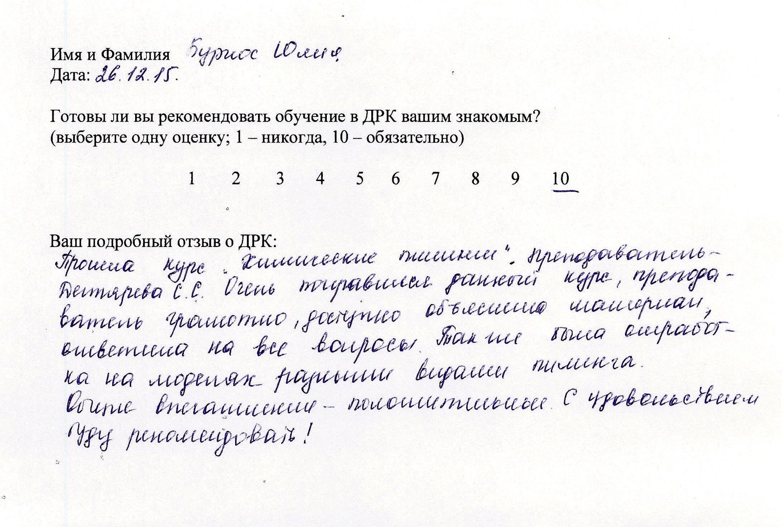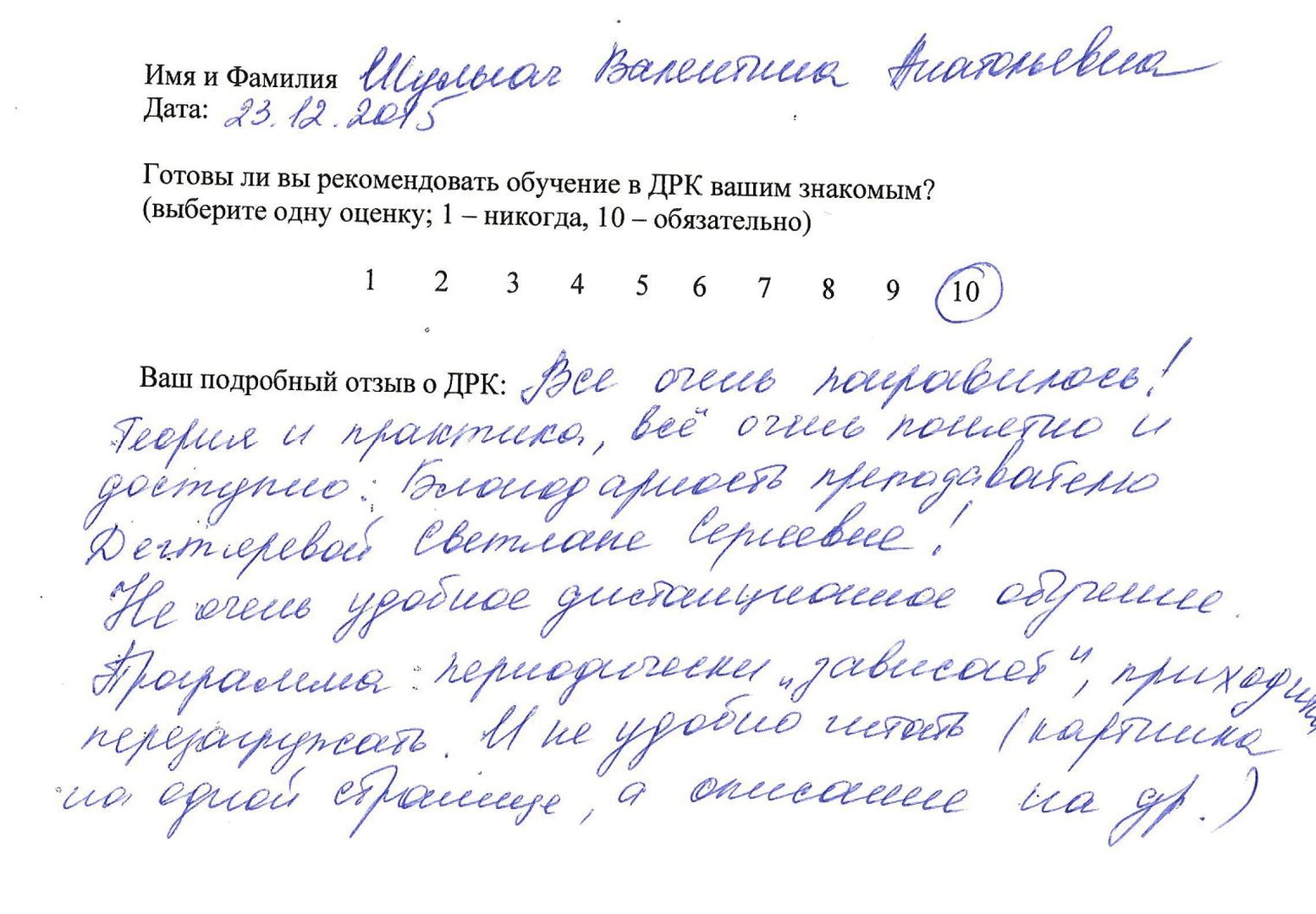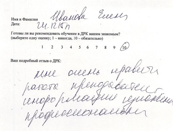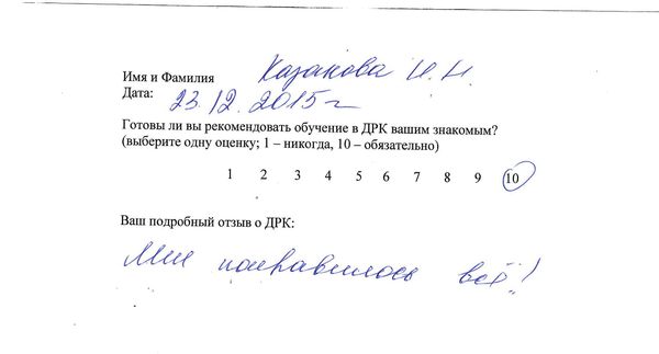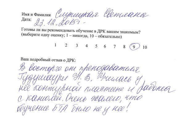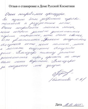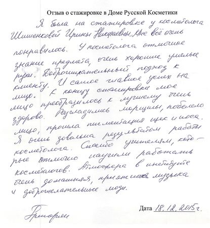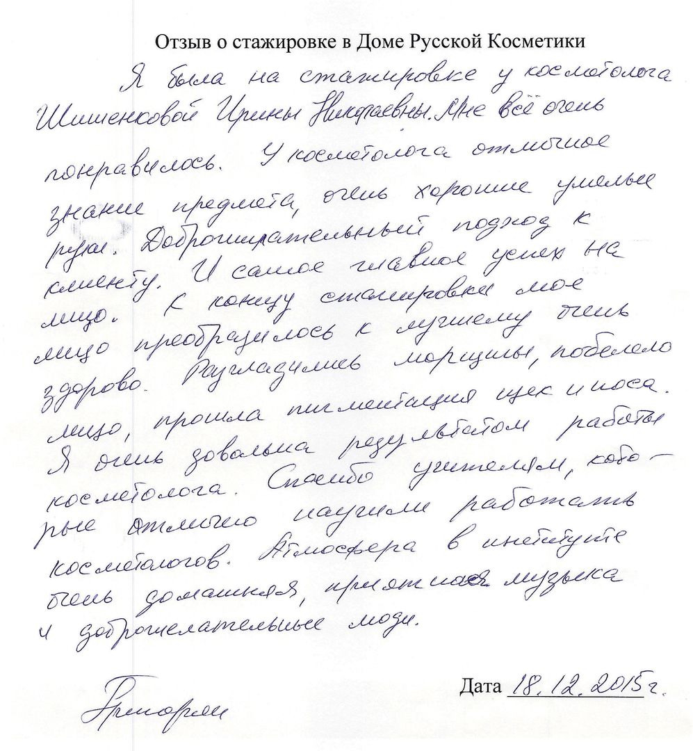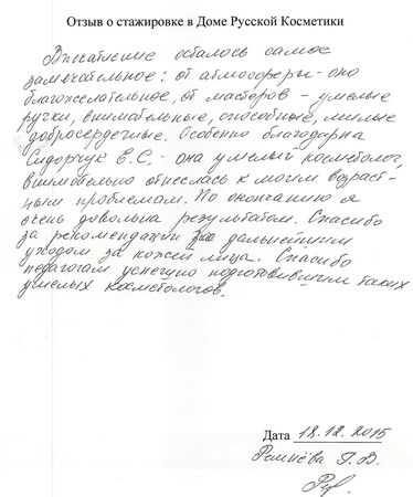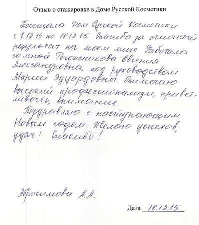 Отзыв о стажировке в Доме Русской Косметики Посещала Дом Русской Косметики 7.12.15 по 18.12.15. Спасибо за отличный результат на моем лице. Работала со мной Рогожникова Евгения Александровна под руководством Марии Эдуардовны. Отмечаю высокий профессионализм, приветливость, внимание. Поздравляю с наступающим Новым годом. Желаю успехов, удач! Спасибо!