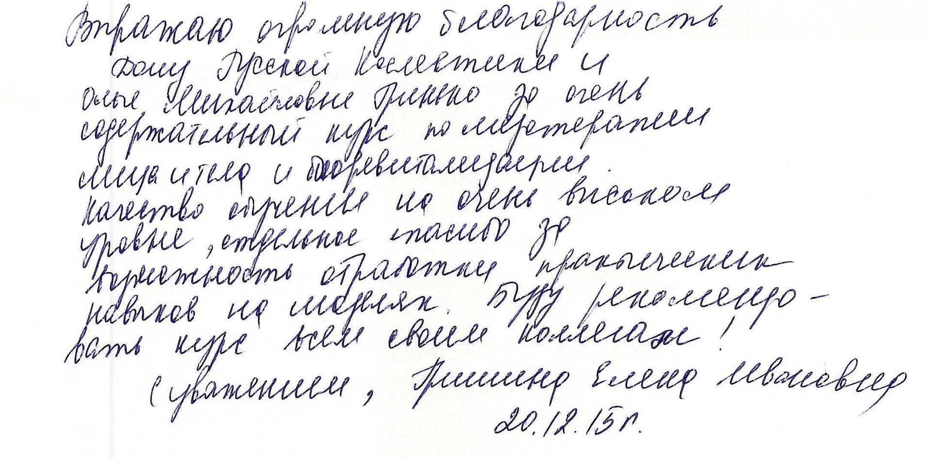 Выражаю огромную благодарность Дому Русской Косметики и Ольге Михайловне Гринько за очень содержательный курс по мезотерапии лица и тела и биоревитализации. Качество обучения на очень высоком уровне, отдельное спасибо за возможность отработки практических навыков на моделях. Буду рекомендовать курс всем своим коллегам! С уважением, Гришина Елена Ивановна