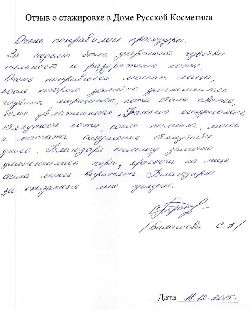 Отзыв о стажировке в Доме Русской Косметики. Очень понравились процедуры. За неделю была устранена чувствительность и раздражение кожи. Очень понравился массаж лица, после которого заметно уменьшилась глубина морщинок, кожа стала светлее, более увлажненная. Раньше ощущалась стянутость кожи, после пилинга, масок и массажа ощущение стянутости ушло. Благодаря пилиингу заметно уменьшились поры, краснота на лице стала менее выражена. Благодарю за оказанные мне услуги.