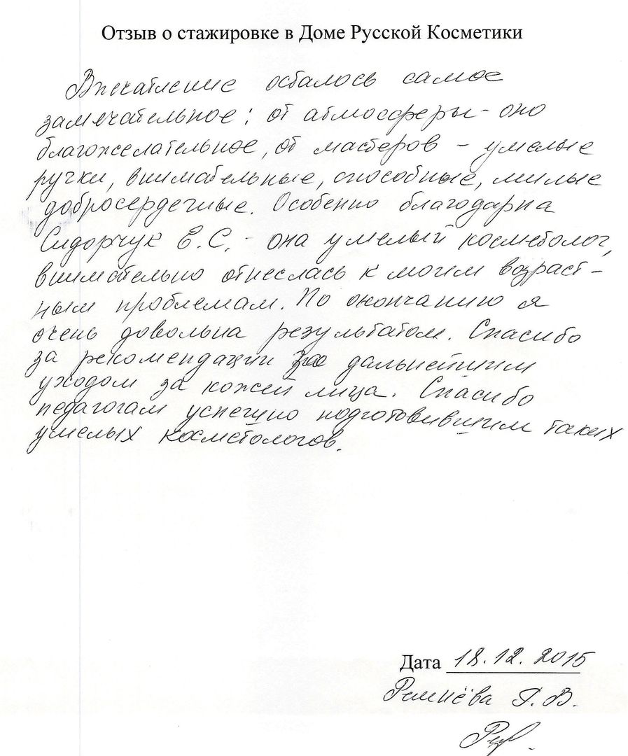 Отзыв о стажировке в Доме Русской Косметики Впечатление осталось самое замечательное: от атмосферы — оно благожелательное, от мастеров — умелые ручки, внимательные, способные, милые, добросердечные. Особенно благодарна Сидорчук Е.С., она умелый косметолог ,внимательно отнеслась к моим возрастным проблемам. По окончанию я очень довольна результатом. Спасибо за рекомендации за дальнейшим уходом за кожей лица. Спасибо педагогам успешно подготовившим таких умелых косметологов.