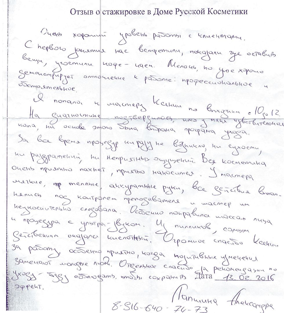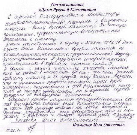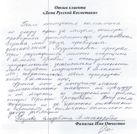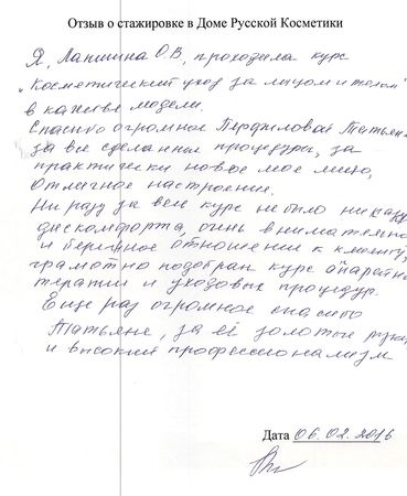 С огромной благодарностью к Институту косметологии, эстетической медицины и визажного искусства — Дому русской косметики. За чёткую организацию, профессионализм, внимательное отношение к клиенту. Моим косметологом в период с 28.01 по 10.02.16 была Бурнос Юлия Михайловна. Хочется отметить её клиентоориентированность, профессиональный подход, заинтересованность в результате, старательность, щепетильность в хорошем смысле этого слова :)). В Юлии я нашла именно те качества, которых так не хватает в настоящее время — желание решить проблему клиента, а не продать ему больше. Надеюсь, что её дальнейший профессиональный путь будет интересным, позитивным и даст возможность получать не только удовольствие, но и хорошее вознаграждение от благодарных клиентов. Отдельно хочется отметить преподавательский состав института, который очень внимательно следил за ходом всех процедур, отвечал на любые вопросы и всячески поддерживал как косметологов, так и моделей. С радостью и пользой провела здесь 10 зимних дней))