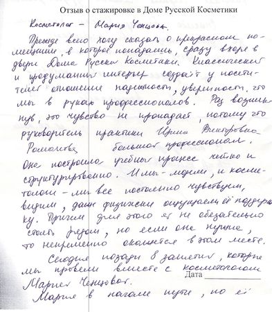 Косметолог — Мария Ченцова Прежде всего, хочу сказать о прекрасном помещении, в которое попадаешь сразу, входя в двери Дома Русской косметики. Классический и продуманный интерьер создаёт у посетителей отношение надёжности, уверенности, что мы в руках профессионалов. Раз возникнув, это чувство не пропадает, потому что руководитель практики Ирина Викторовна Романова большой профессионал. Она построили учебный процесс чётко и структурировано. И мы — модели, и косметологи — мы все постоянно чувствуем, видим, даже физически ощущаем её поддержку. Причём для этого ей не обязательно стоять рядом, но если она нужна, то непременно окажется в этом месте. Сегодня позади 8 занятий, которые мы провели вместе с косметологом Марией Ченцовой.