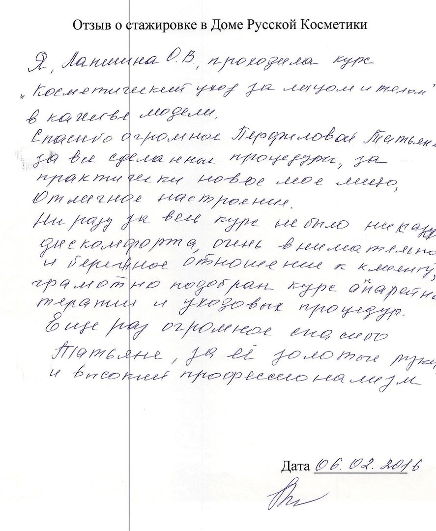 Я, Лапшина О.В., проходила курс “Косметический уход за лицом и телом” в качестве модели. Спасибо огромное Перфиловой Татьяне за все сделанные процедуры, за практически новое моё лицо, отличное настроение. Ни разу за весь курс не было никакого дискомфорта, очень внимательное и бережное отношение к клиенту, грамотно подобран курс аппаратной терапии и уходовых процедур. Ещё раз огромное спасибо Татьяне за её золотые руки и высокий профессионализм.