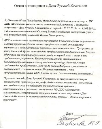 Я, Солнцева Юлия Геннадьевна, проходила курс ухода за кожей лица в ЧУ ДПО “Институт косметологии, эстетической медицины и визажного искусства — Дом русской косметики” в период с 16.01.16 по 13.02.16 г. у Косметолога-эстетиста Солонец Елены Николаевны (воскресная группа под руководством Романовой Ирины Викторовны). ДРК оставил самые позитивные впетчаления и замечательные результаты. Мастер проявла себя как высокопрофессиональный специалист с вдумчивым и индивидуальным подходом, знающим своё дело. Программа по уходу была подобрана на основании професииональной диагностики. Мастер объяснила все этапы по уходу за кожей лица и тела и они сработали на результат. Также хочу отметить тактичность и деликатность мастера в ходе проведения процедур. Косметические средства для профессионального ухода были подобраны с учётом всех особенностей состояния кожи. Хочется отметить, что профессиональная линия EGIA biocare system даёт отличные результаты! Огромное спасибо Дому Русской Косметики за такую замечательную возможность пройти курс по уходу. Ведь в таком мегаполисе как Москва, это крайне важно и необходимо для поддержания красоты, женственности и отличного настроения. ЧУ ДПО “Институт косметологии, эстетической медицины и визажного искусства — Дом Русской Косметики” является именно таким местом — Домом здоровья и красоты!!!