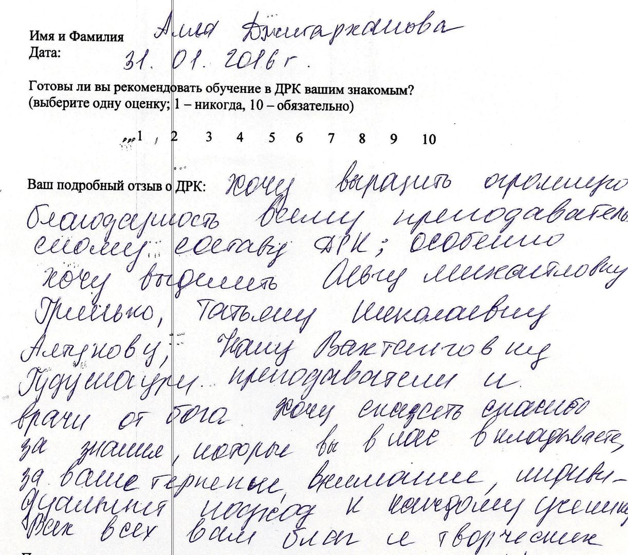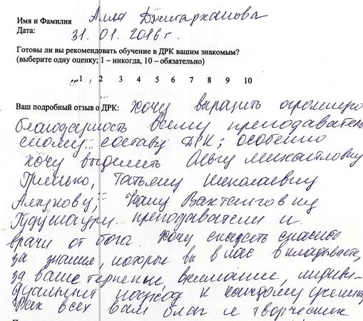 Хочу выразить огромную благодарность всему преподавательскому составу ДРК; особенно хочу выделить Ольгу Михайловну Гринько, Татьяну Николаевну Алтухову, Нану Вахтанговну Гудушаури. Преподаватели и врачи от бога. Хочу сказать спасибо за знания, которые вы в нас вкладываете, за ваш терпение, внимание, индивидуальный подход к каждому ученику. Всех всех вам благ и творческих побед!