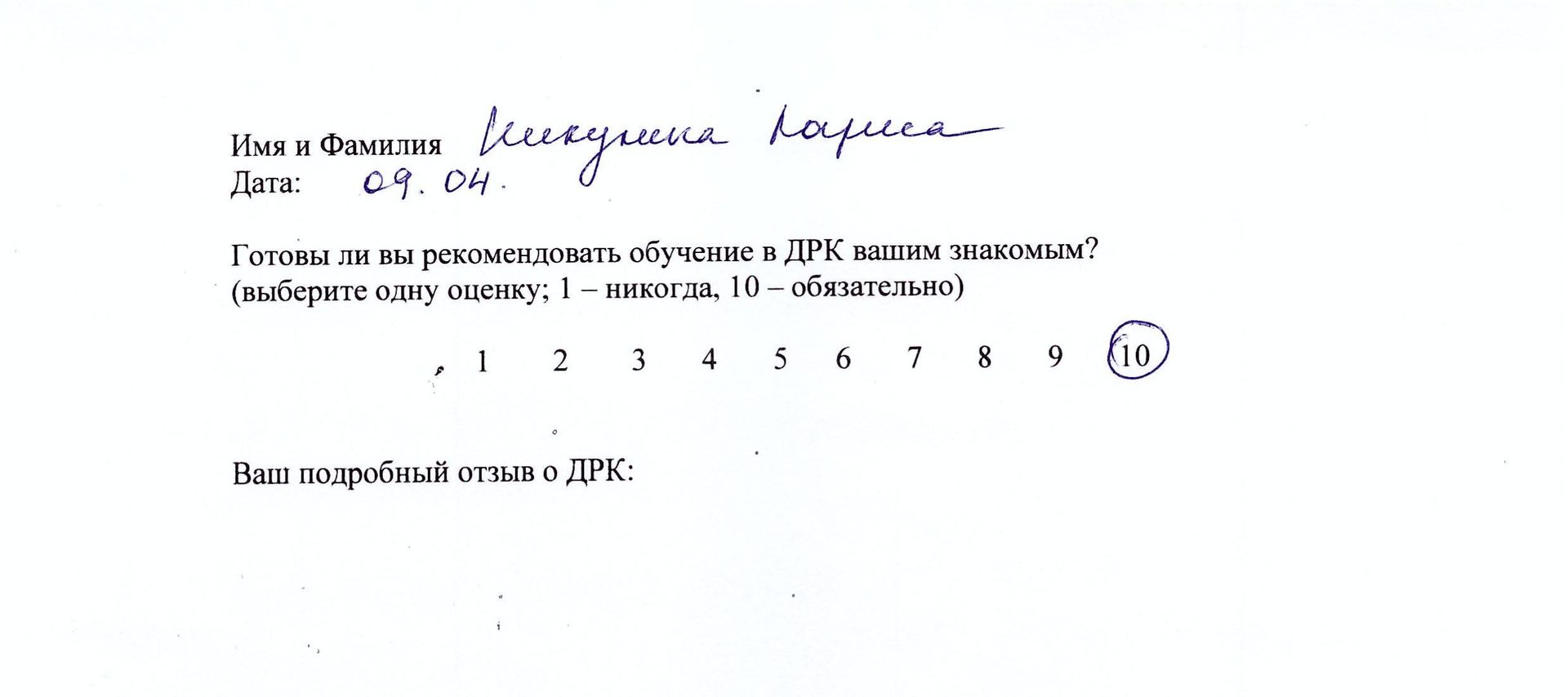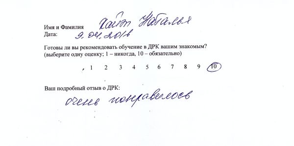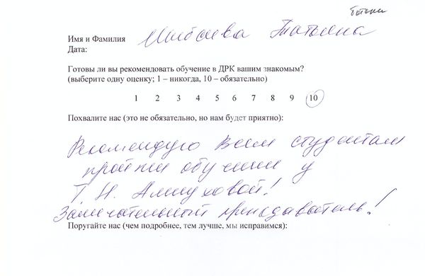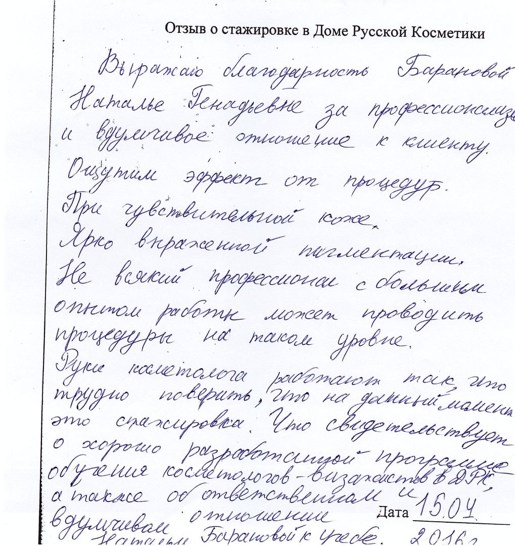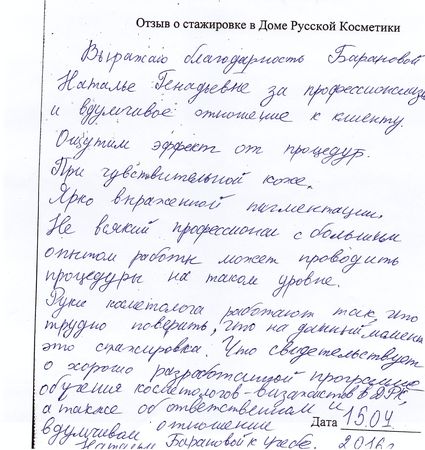 Выражаю благодарность Барановой Наталье Геннадьевне за профессионализм и вдумчивое отношение к клиенту. Ощутим эффект от процедур. При чувствительной коже, ярко выраженной пигментации. Не всякий профессионал с большим опытом работы может проводить процедуры на таком уровне. Руки косметолога работают так, что трудно поверить, что на данный момент это стажировка. Что свидетельствует о хорошо разработанной программе обучения косметологов-визажистов в ДРК, а также об ответственном и вдумчивом отношении Натальи Барановой к учёбе.