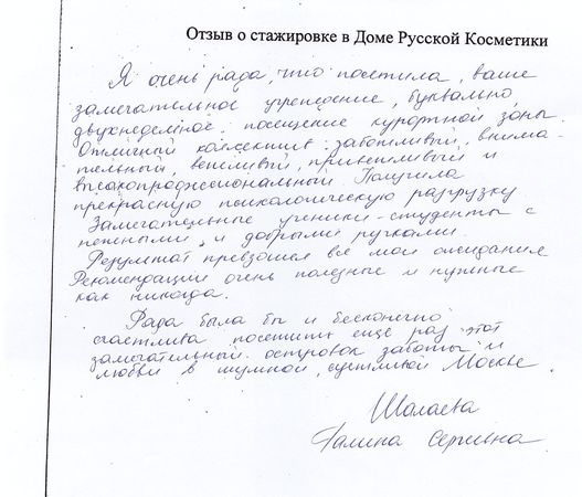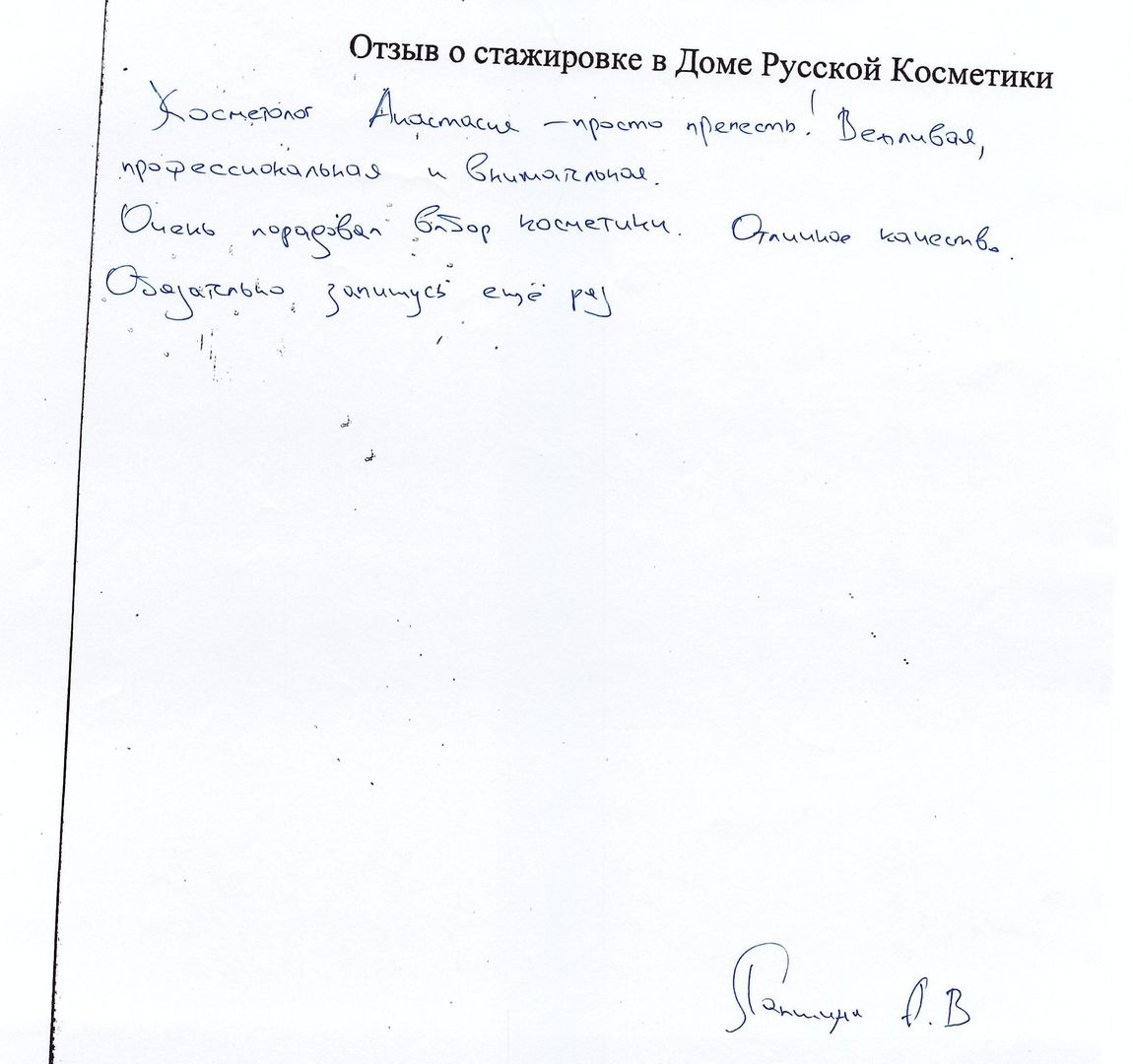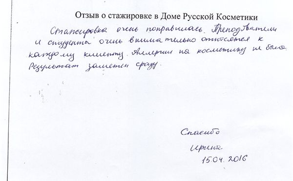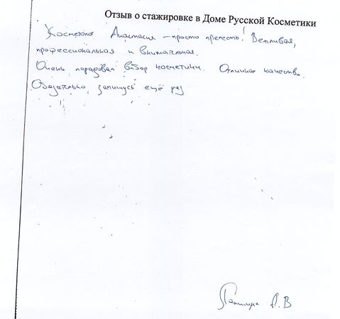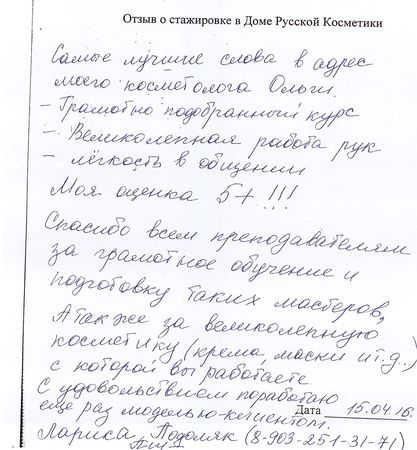 Самые лучшие слова в адрес моего косметолога Ольги. Грамотно подобранный курс Великолепная работа рук Лёгкость в общении Моя оценка 5+!!! Спасибо всем преподавателям за грамотное обучение подготовку таких мастеров, а также за великолепную косметику (крема, маски и.т.д.) с которой вы работаете. С удовольствием поработаю ещё раз моделью-клиентом.