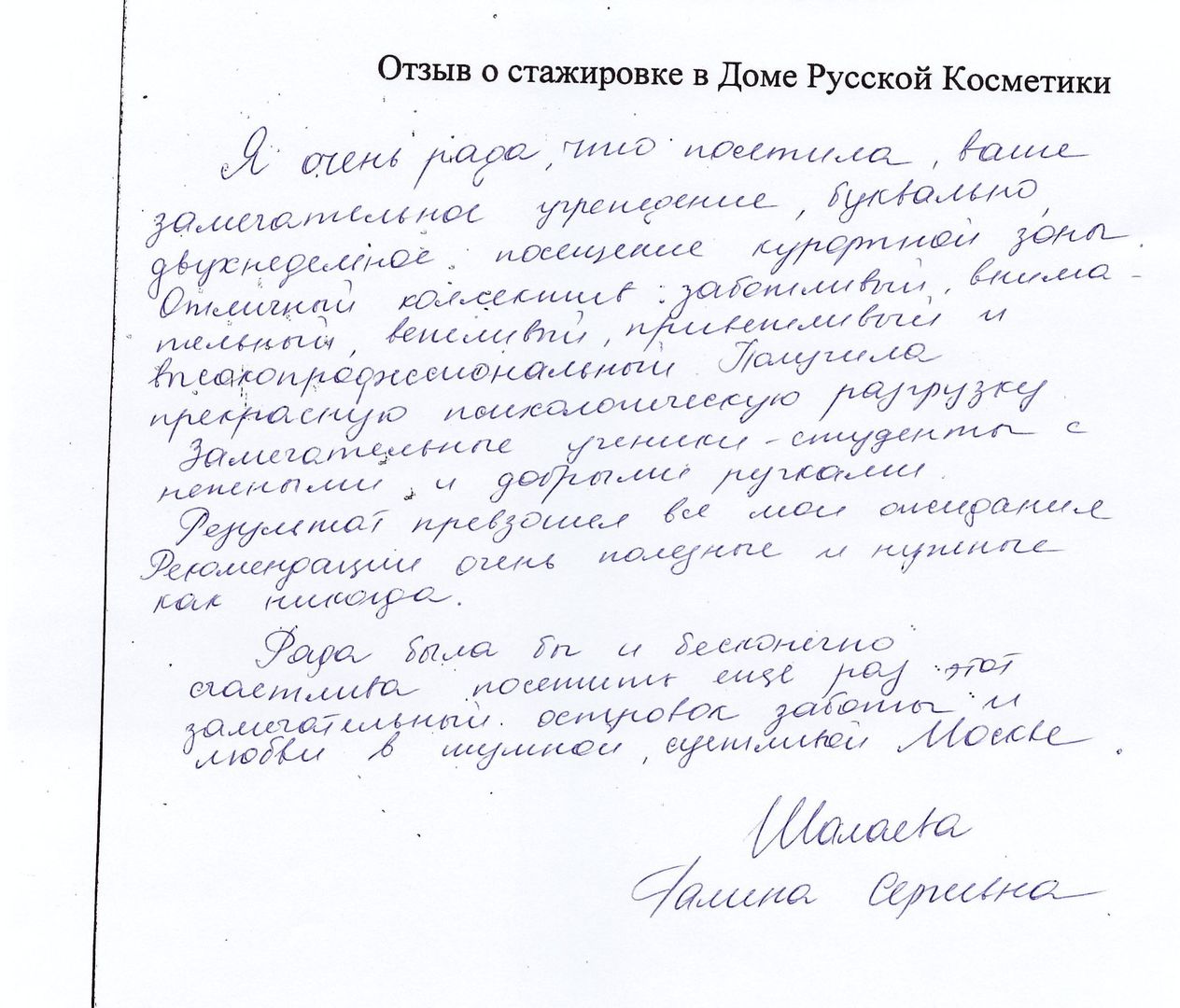 Я очень рада, что посетила ваше замечательное учреждение, буквально, двухнедельное посещение курортной зоны. Отличный коллектив: заботливый, внимательный, вежливый, приветливый и высокопрофессиональный. Получила прекрасную психологическую разгрузку. Замечательные ученики-студенты с нежными и добрыми ручками. Результат превзошёл все мои ожидания. Рекомендации очень полезные и нужные как никогда. Рада была бы и бесконечно счастлива посетить ещё раз этот замечательный островок заботы и любви в шумной суетливой Москве.