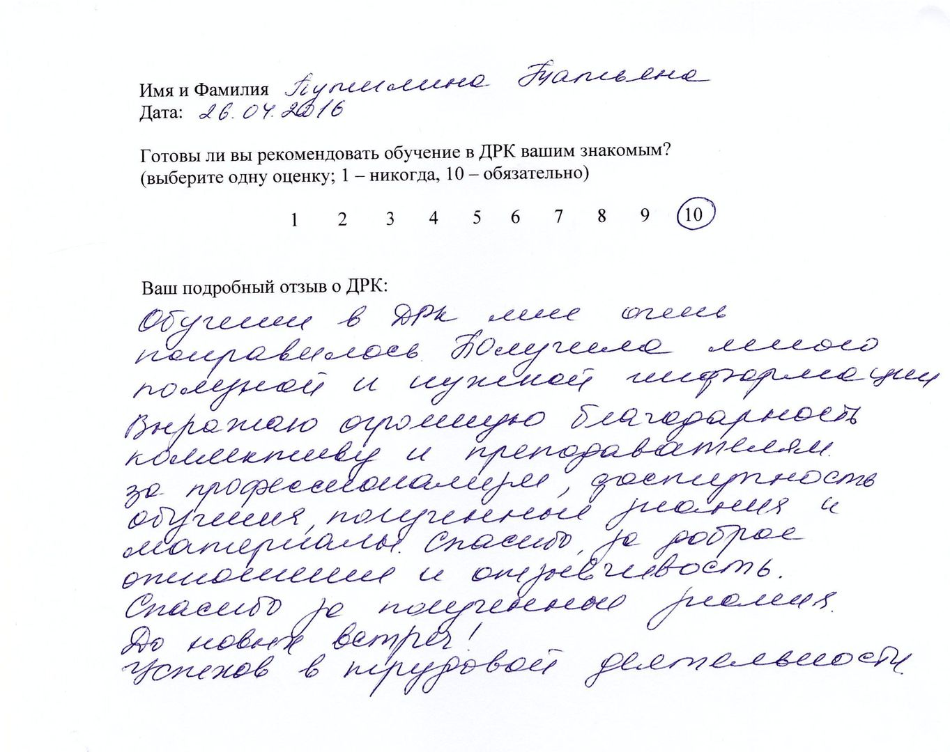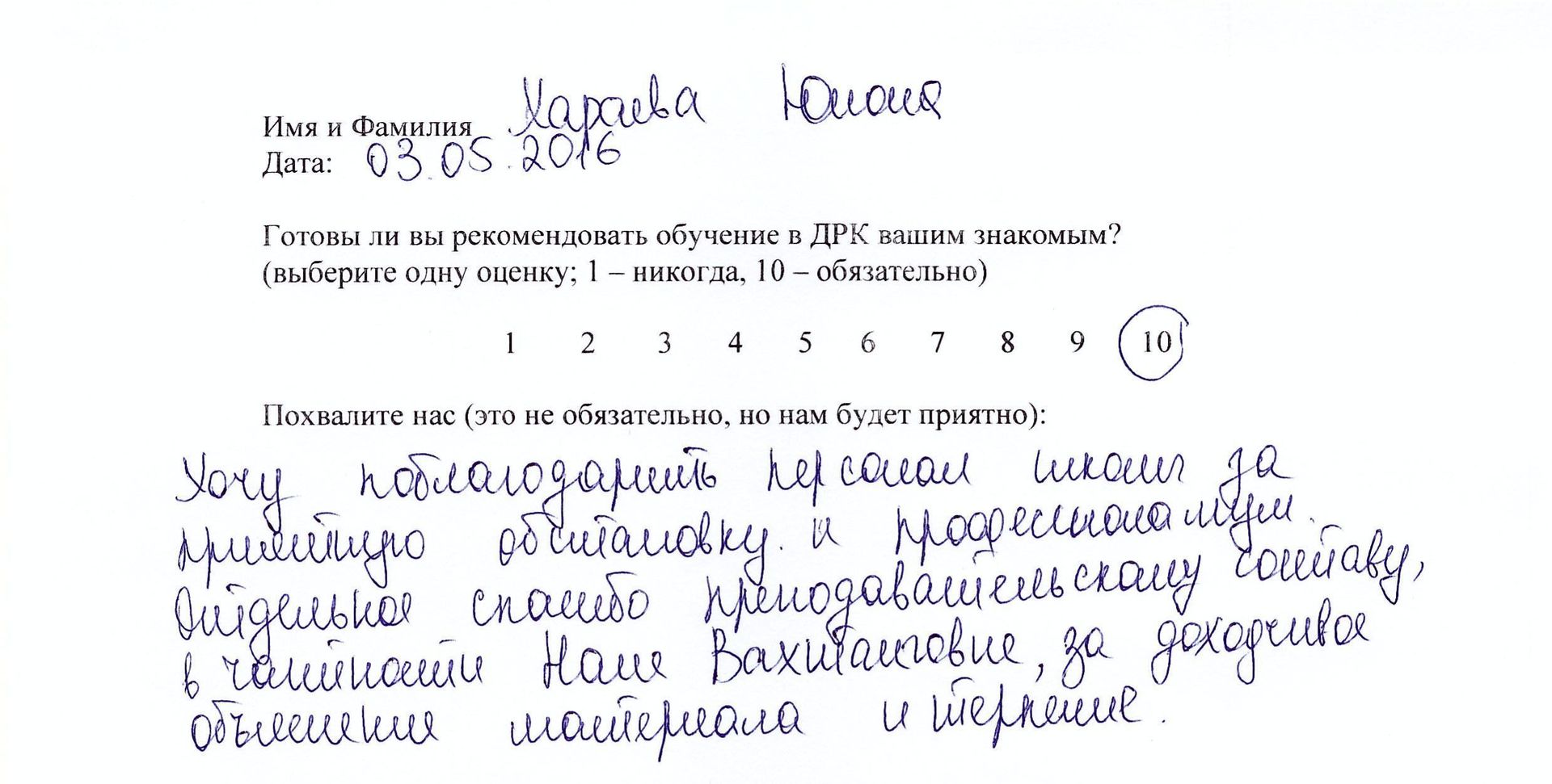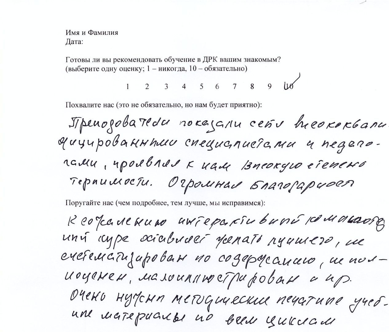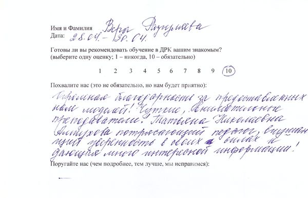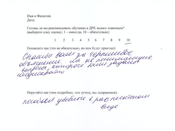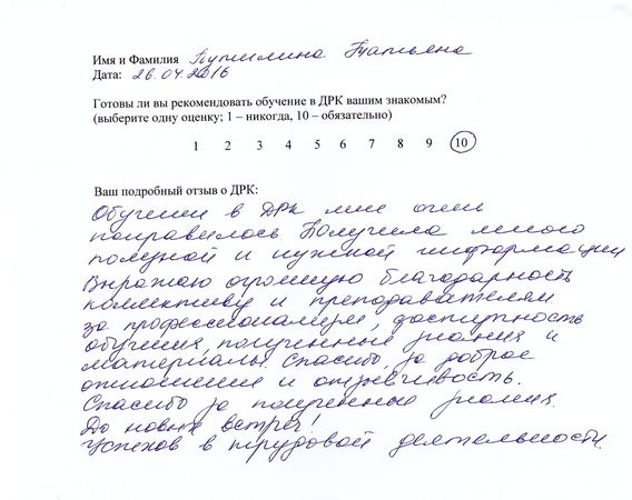 Обучение в ДРК мне очень понравилось. Получила много полезной и нужной информации. Выражаю огромную благодарность коллективу и преподавателя за профессионализм, доступность обучения, полученные знания и материалы. Спасибо за доброе отношение и отзывчивость. Спасибо за полученные знания. До новых встреч!