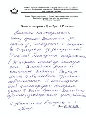 Благодарю Дом Русской Косметики за собрание уникальных методик и подготовку высококлассных специалистов. Благодарю весь преподавательский состав и коллектив ДРК за вклад в красоту самых красивых женщин мира! Отдельная благодарность за чуткость и профессионализм Шерхоновой Фарангис Дустиевне. Продолжайте благое дело!