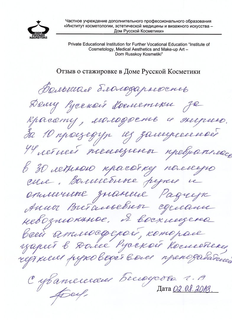 Большая благодарность Дому Русской Косметики за красоту, молодость и энергию. За 10 процедур из замученной 44 летней женщины превратилась в 30 летнюю красотку, полную сил. Волшебные руки и отличные знания Радчук Анны Витальевны сделали невозможное. Я восхищена всей атмосферой, которая царит в Доме Русской Косметики, чутким руководством преподавателей.