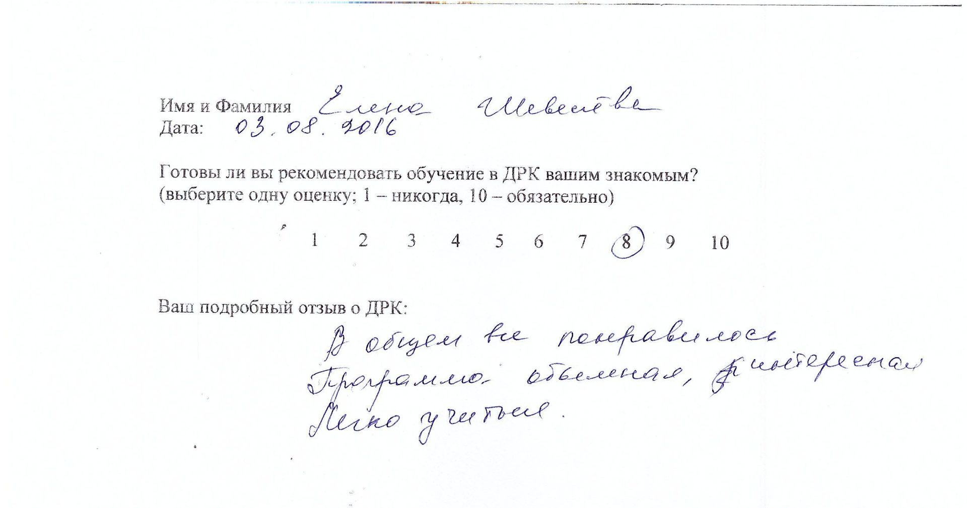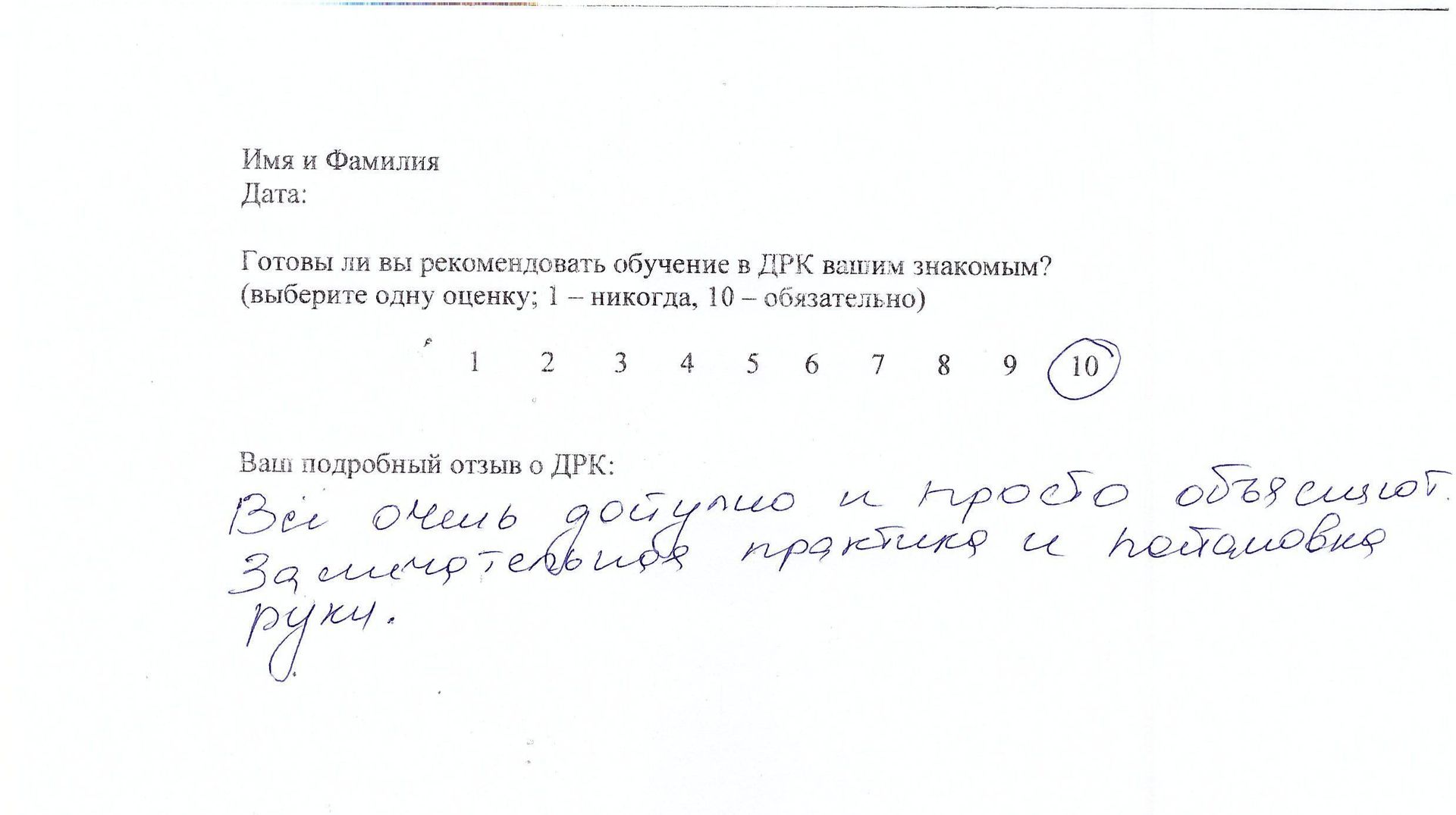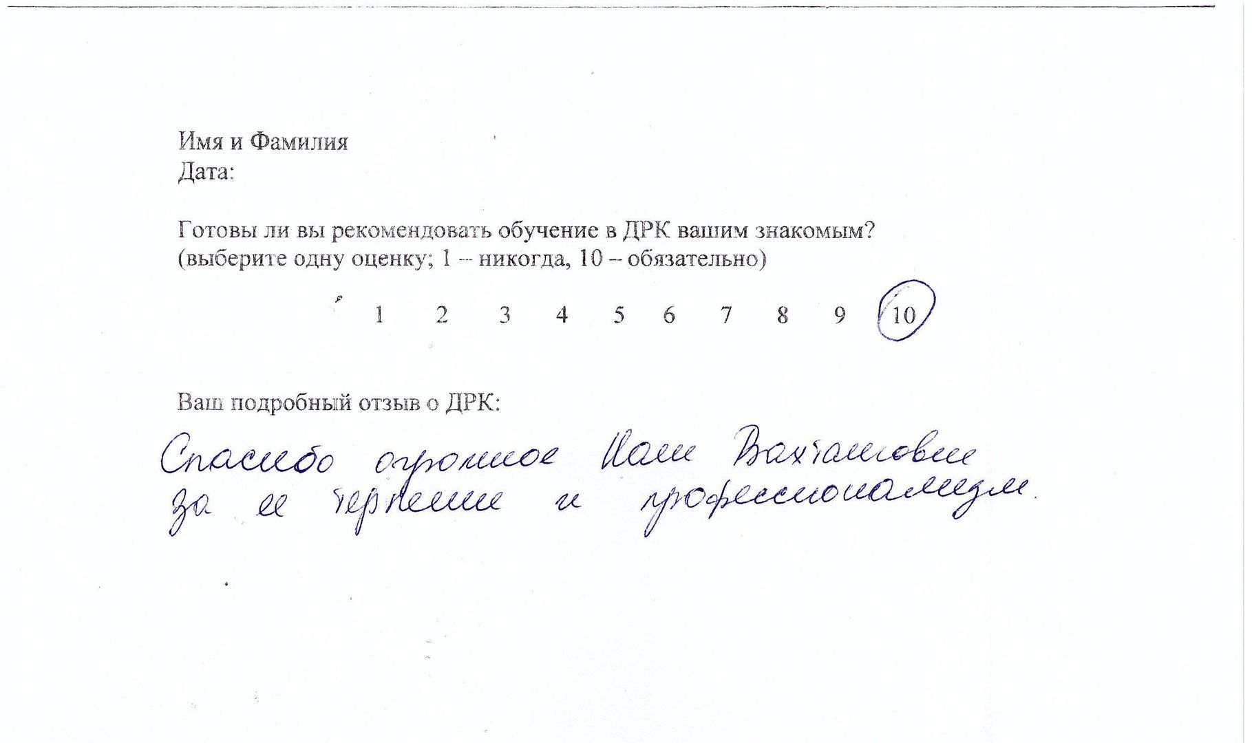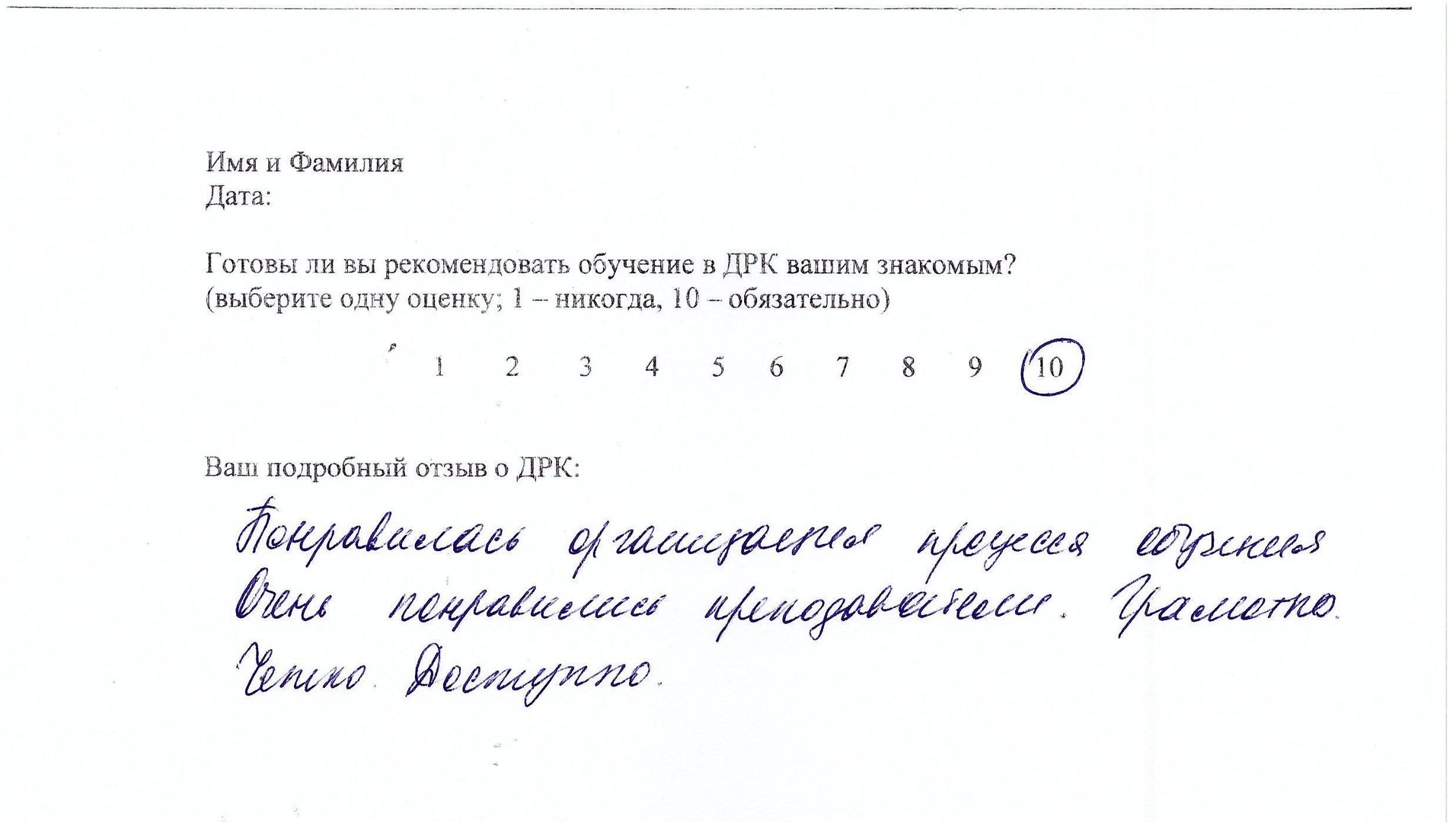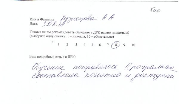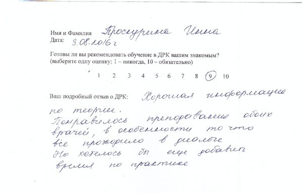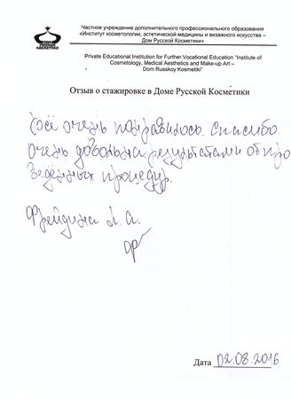 Я рада, что попала на стажировку в ДРК. Мне уделили большое внимание в работе с моим лицом. Мой косметолог Е. И. Костова была внимательна и предупредительна. К работе относилась серьезно.