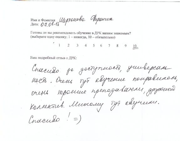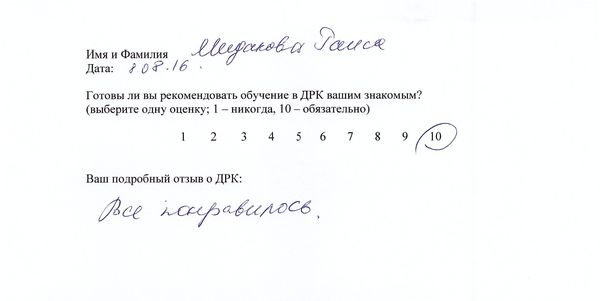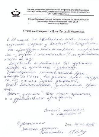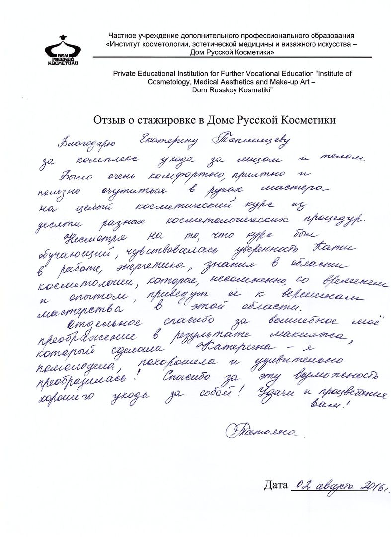С 20 мая по 2 августа 2016г. была в качестве модели у Колтаговой Елизаветы. Все процедуры были построены по программе «Борьба с целлюлитом!» на проблемные места по телу. Елизавета отработала все изученные методы на практике – успешно. Чувствуется поставленная рука. Пальцы мягкие, все делала очень аккуратно, без лишних резких движений. Очень внимательная, заботливая, трепетная. Быть «моделью» было очень приятно, и с удовольствием приходила. Спасибо педагогам и Елизавете К. С уважением, Знатная Марина Николаевна.