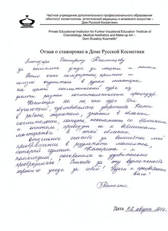 Благодарю Екатерину Теплищеву за комплекс ухода за лицом и телом. Было очень комфортно, приятно и полезно очутиться в руках мастера на целый косметический курс из десяти разных косметологических процедур. Несмотря на то, что курс был обучающий, чувствовалась уверенность Кати в работе, энергетика, знания в области косметологии, которые, несомненно, со временем и опытом, приведут её к вершинам мастерства в этой области. Отдельное спасибо за волшебное моё преображение в результате макияжа, который сделала Катерина – я помолодела, похорошела и удивительно преобразилась! Спасибо за эту позможность хорошего ухода за собой! Удачи и процветания вам!