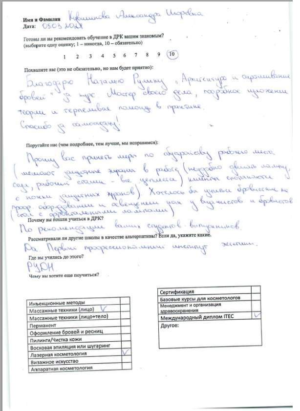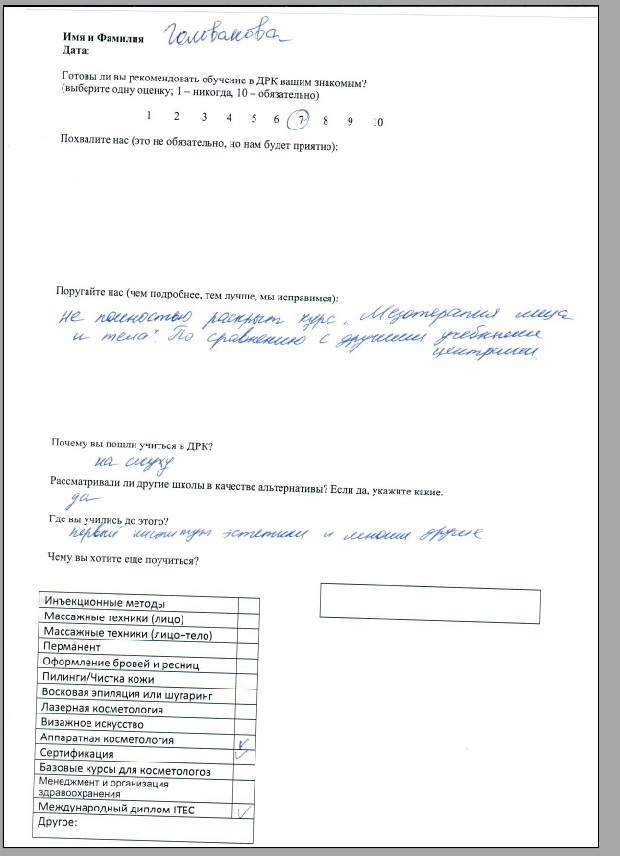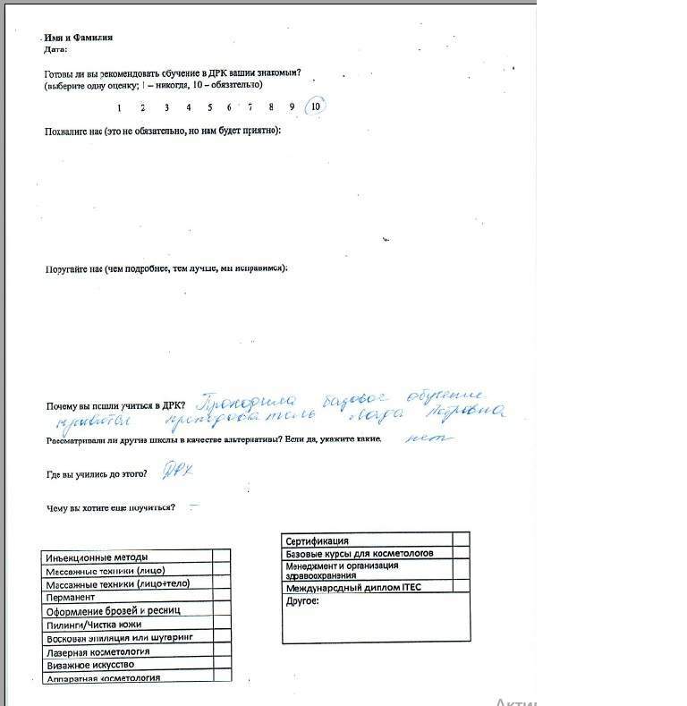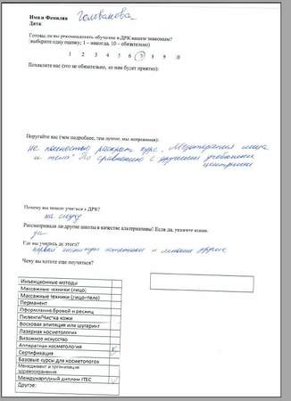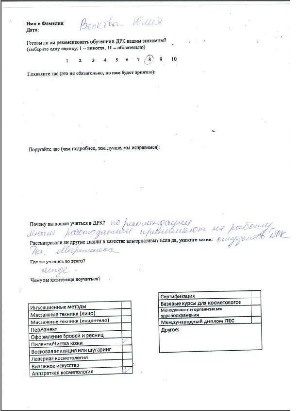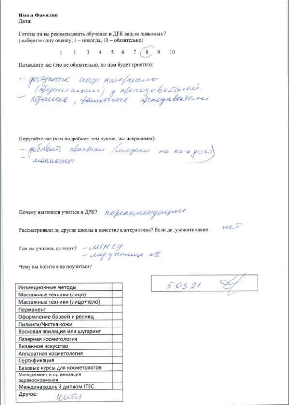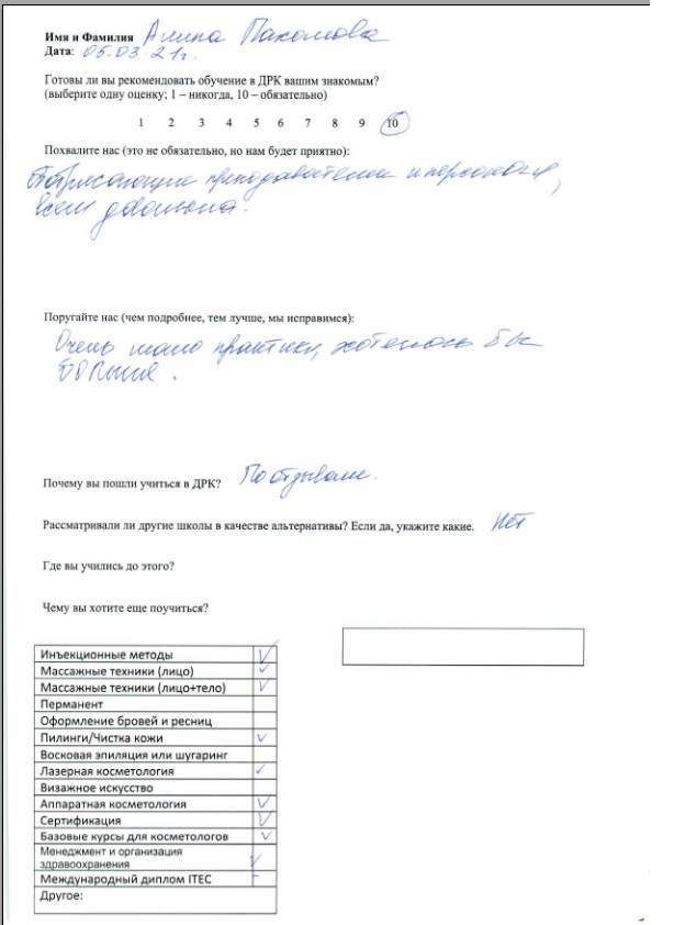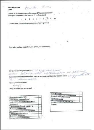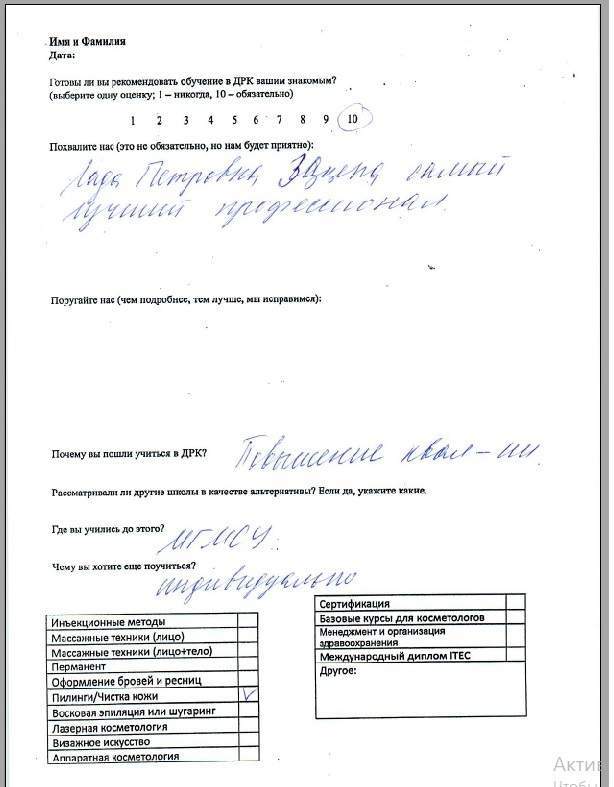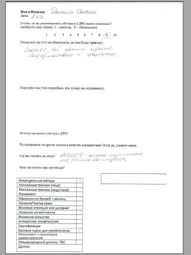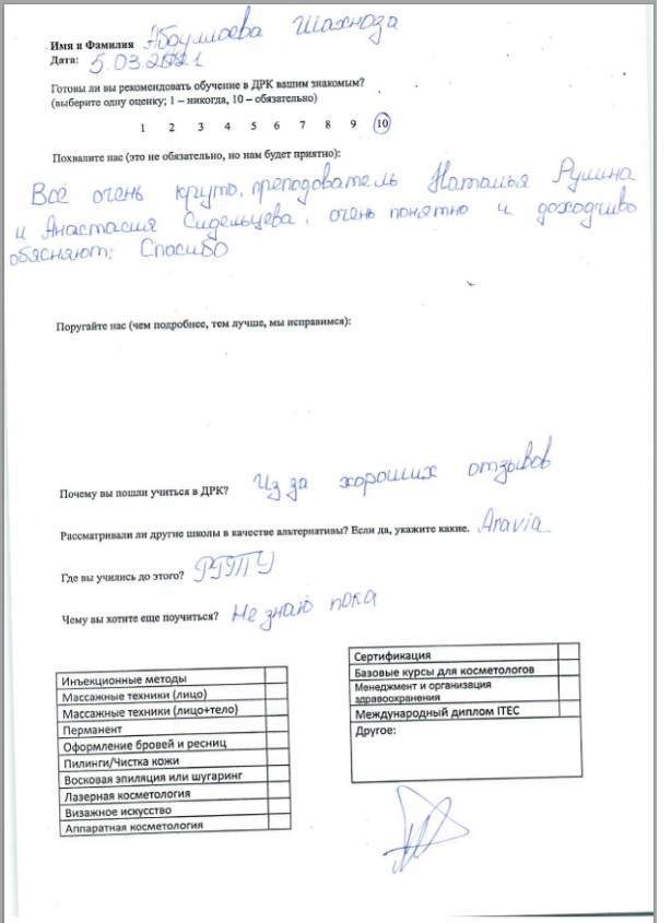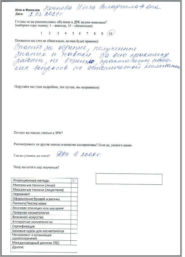 Спасибо за обучение, полученные знания и навыки. За всю практику работы не возникло практически никаких вопросов по эстетической косметологии.