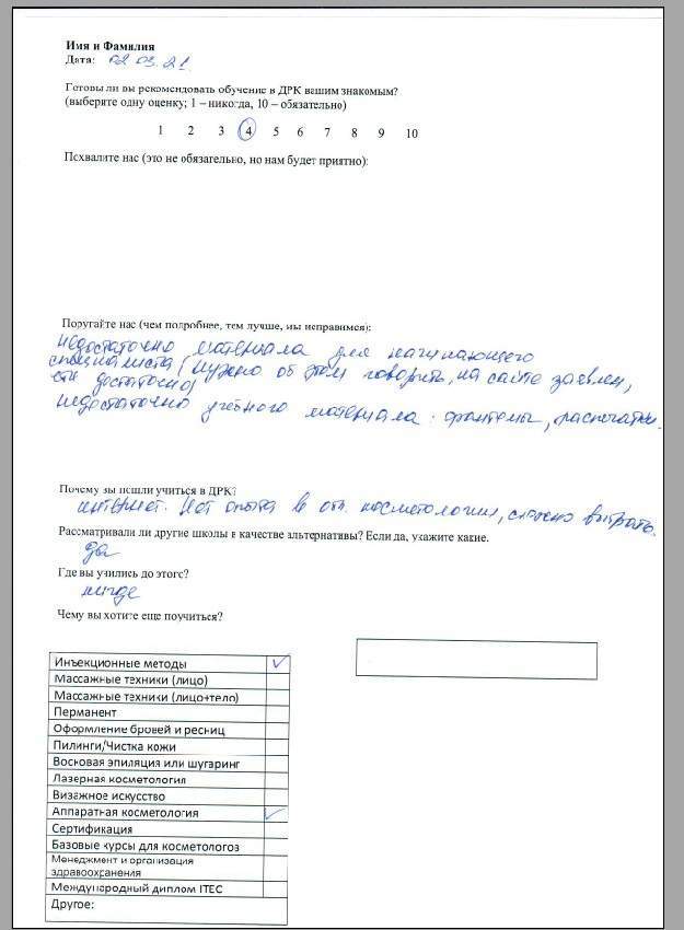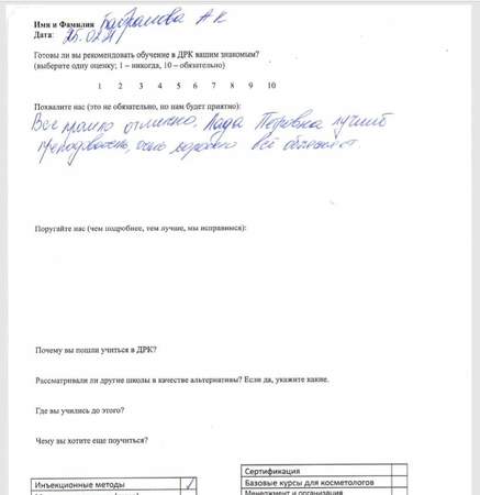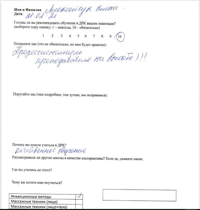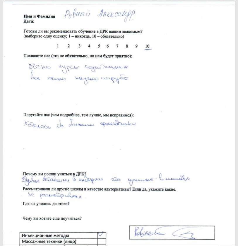 Очень курсы поучительные. Все очень научно и круто. Хотелось бы больше практики. Судя по отзывам в интернете – вы лучшие в Москве, поэтому альтернативы при выборе не рассматривал. Буду продолжать у вас изучать инъекционные методы