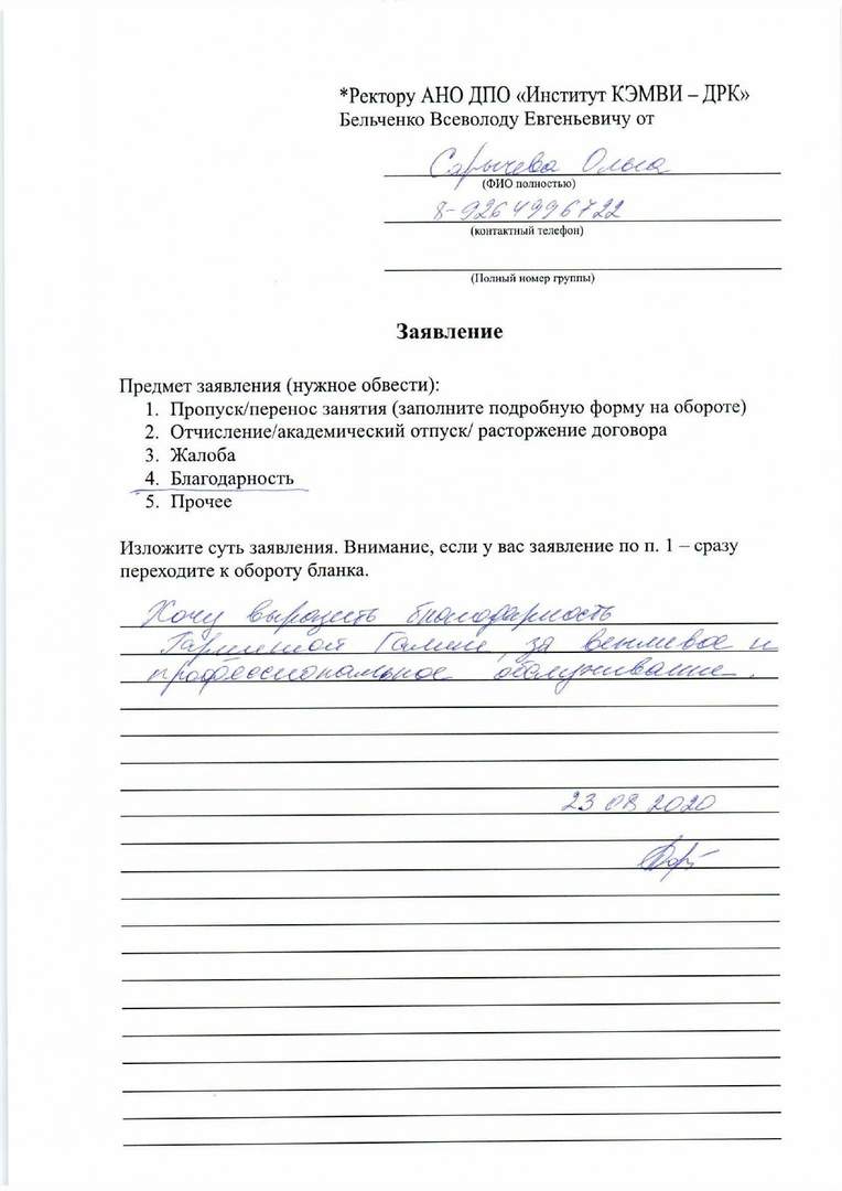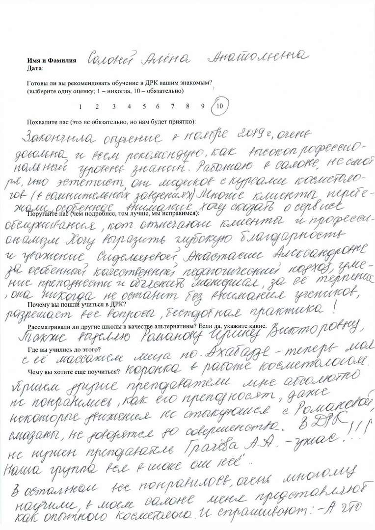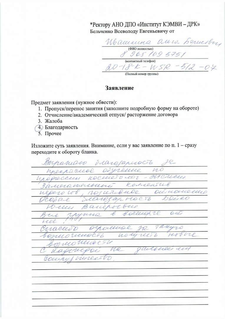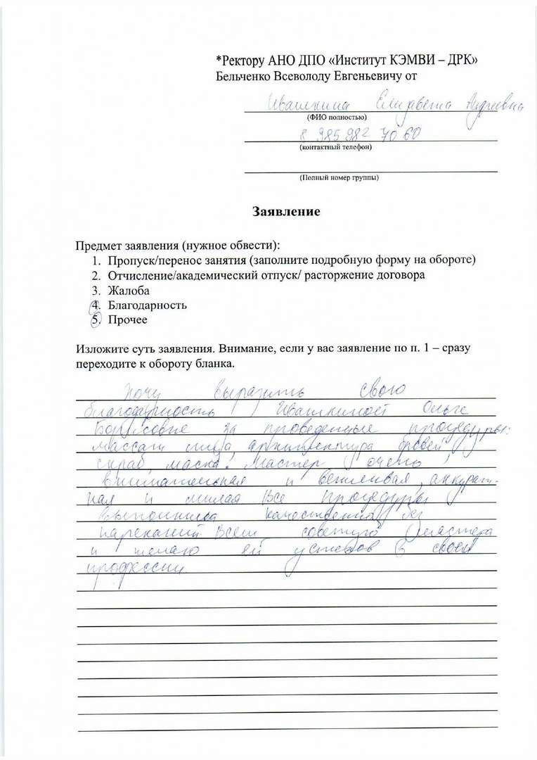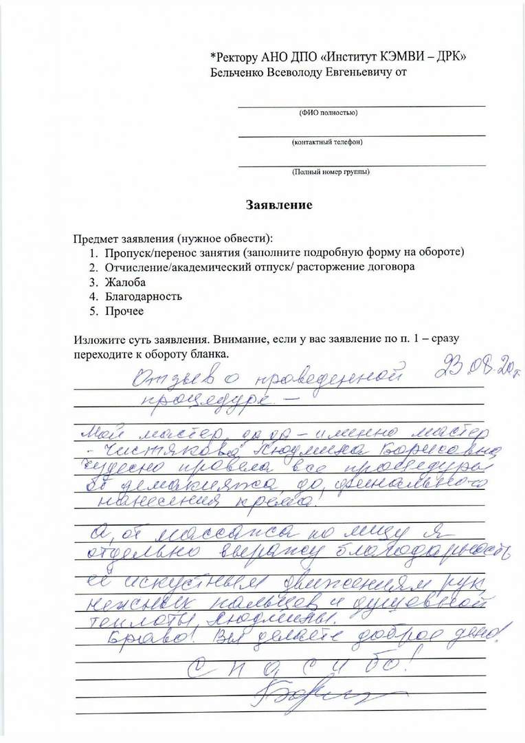 Выражаю искреннюю благодарность преподавателю Елеевой Зухре Анастасии за все сделанные процедуры 23 августа 2020 года. Преподаватель на экзамене сделала очень качественно, тщательно и внимательно! Зухра дала рекомендации, как быть с моей проблемной кожей, как ухаживать, чтобы восстановить лицо. Зухра сделала хорошо уз чистку, отличный массаж, подобрала подходящий цвет для бровей - и это лишь малая часть того, что заполнилось вспомнилось во время написания отзыва. Желаю успехов институту по развитию навыков таких способных преподавателей с золотыми руками Зухры, удачи и успехов