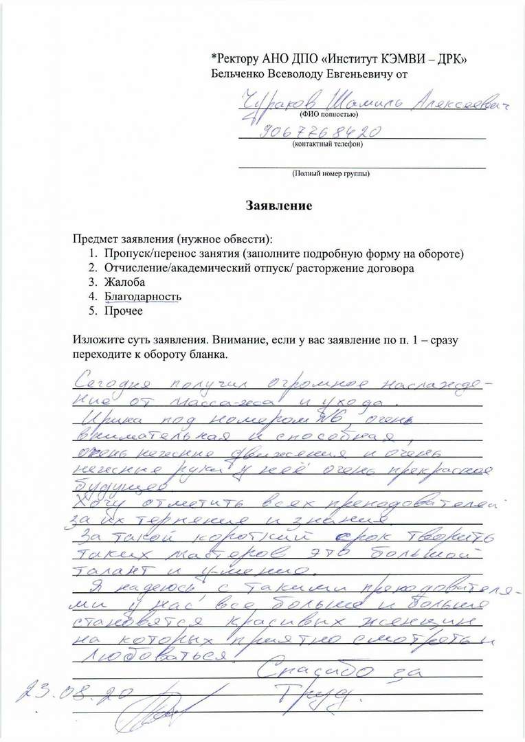 Сегодня получил огромное наслаждение от массажа и ухода. Ирина под №6 очень внимательная и способная, очень нежные руки и очень нежные движения у неё очень прекрасное будущее. Хочу отметить всех преподавателей за их терпение и знания. За такой короткий срок творить таких мастеров это большой талант и умение. Я надеюсь с такими преподавателями у вас всё больше и больше становиться красивых женщин на которых приятно смотреть, любоваться