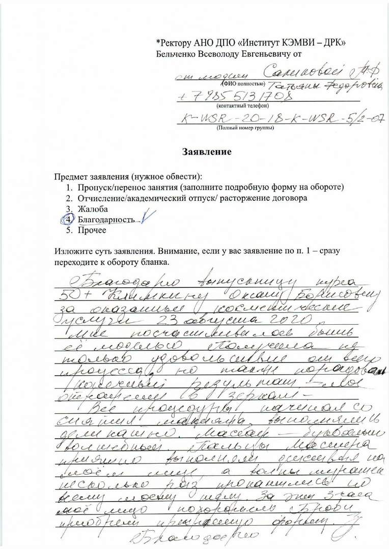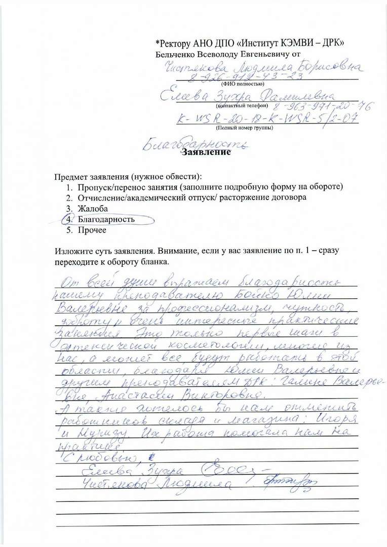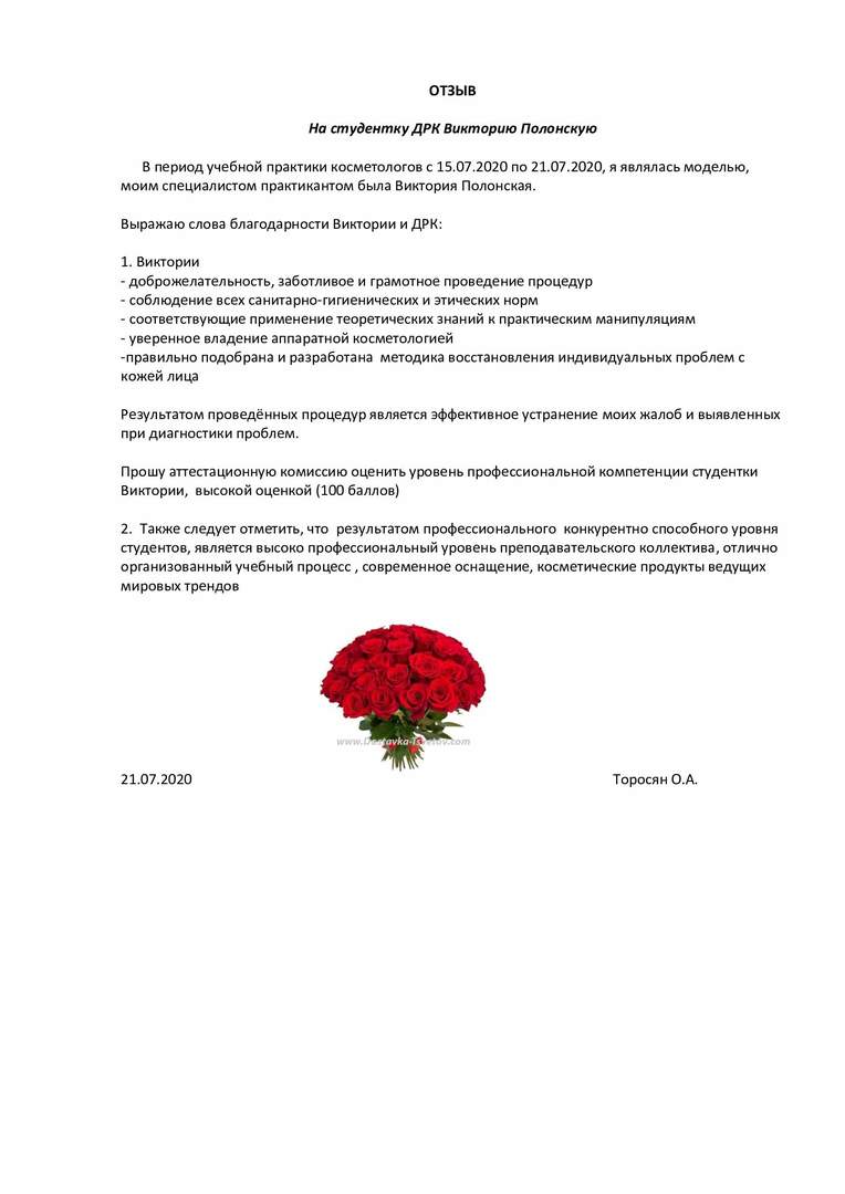 В период учебной практики косметологов с 15.07.2020 по 21.07.2020, я являлась моделью, моим специалистом практикантом была Виктория Полонская. Выражаю слова благодарности Виктории и ДРК: 1. Виктории - доброжелательность, заботливое и грамотное проведение процедур - соблюдение всех санитарно-гигиенических и этических норм - соответствующие применение теоретических знаний к практическим манипуляциям - уверенное владение аппаратной косметологией -правильно подобрана и разработана методика восстановления индивидуальных проблем с кожей лица Результатом проведённых процедур является эффективное устранение моих жалоб и выявленных при диагностики проблем. Прошу аттестационную комиссию оценить уровень профессиональной компетенции студентки Виктории, высокой оценкой (100 баллов) 2. Также следует отметить, что результатом профессионального конкурентно способного уровня студентов, является высоко профессиональный уровень преподавательского коллектива, отлично организованный учебный процесс , современное оснащение, косметические продукты ведущих мировых трендов