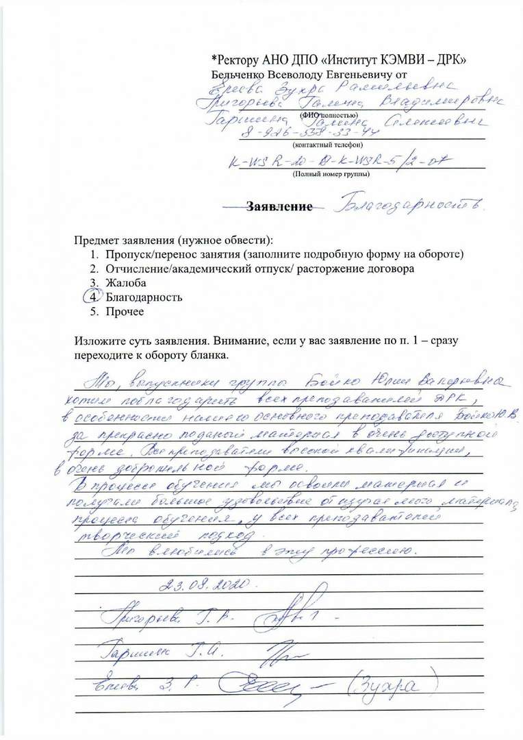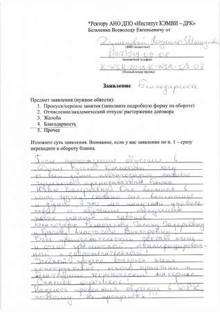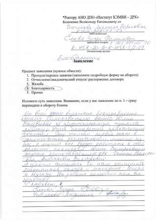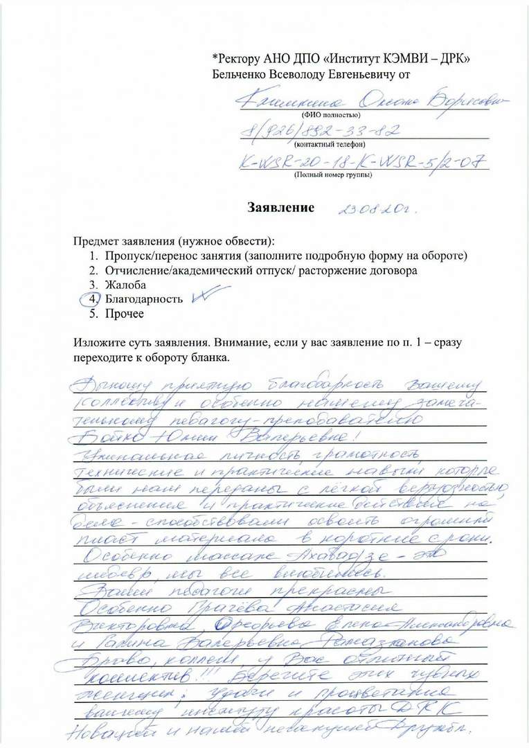Хочу высказать восторг от обучения в вашем институте. Время просто пронеслось. Доброжелательное отношение, профессионализм преподавателей, просто восхищает. Огромное спасибо преподавателю, нашей замечательной Бойко Ю.В., Анастасии Викторовне, Галине Валерьевне и не менее Александре и другим. Отдельная благодарность за внимательную отношение и заботу Лобано. Было очень приятно с вами работать.