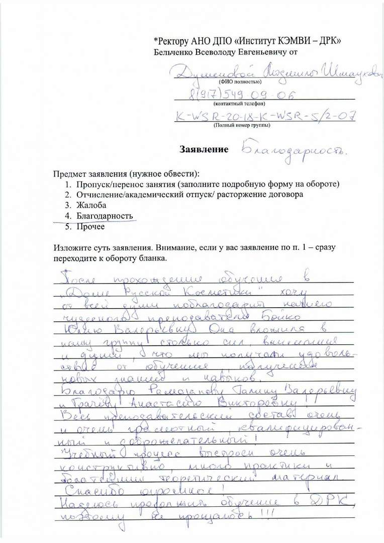 Доношу приятную благодарность вашему коллективу и особенно нашему замечательному педагогу-преподавателю Бойко Ю.В. Уникальная личность, грамотность, технические и практические навыки которые были нам переданы с легкой виртуозностью, объяснениями и практические действия на деле - способствовали освоить огромный пласт материла в короткие сроки. Особенно массаж Ахарбазе - это шедевр, мы все влюбились. Ваши педагоги прекрасны, особенно Грачёва Анастасия Викторовна, Ореорьевная Елена Александровна и Галина Валерьевна Рамазанова. Браво коллеги у вас опытный коллектив! Берегите этих женщин. Удачи и процветание вашему институту красоты ДРК!