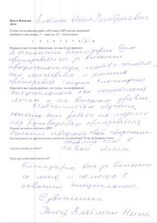 С огромной благодарностью и поклоном лучшему преподавателю за всю мою жизнь. За высшее проявление профессионализма и благородства и педагогического дара в одном человеке - это прекрасно. Желаю всем здоровья, и нашему преподавателю - Романовой Ирине Викторовне огромное спасибо за её дар. Продолжайте профессиональную деятельность на благо ДРК и студентов.