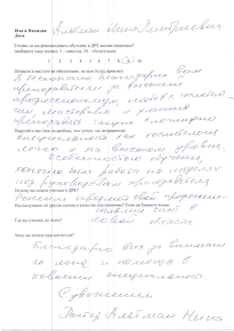 Я бесконечно благодарна всем преподавателям за высокий профессионализм, любовь к косметологии, мастерство и умение преподавать, такую сложную специальность как косметология легко и на высоком уровне. Особенностью обусения, конечно, была работа на моделях под руководством преподавателя. Решила продлить свой профессиональный опыт в новой области. Благодарю всех за внимательность ко мне и помощь в освоении специальности.