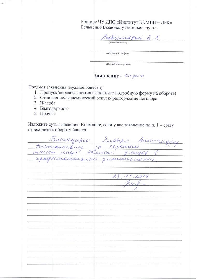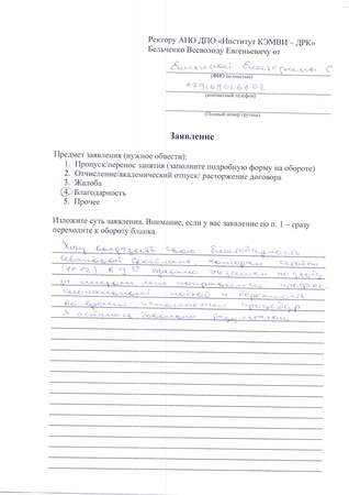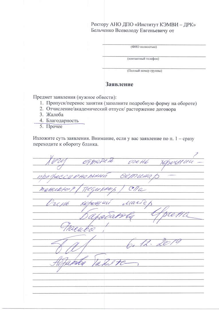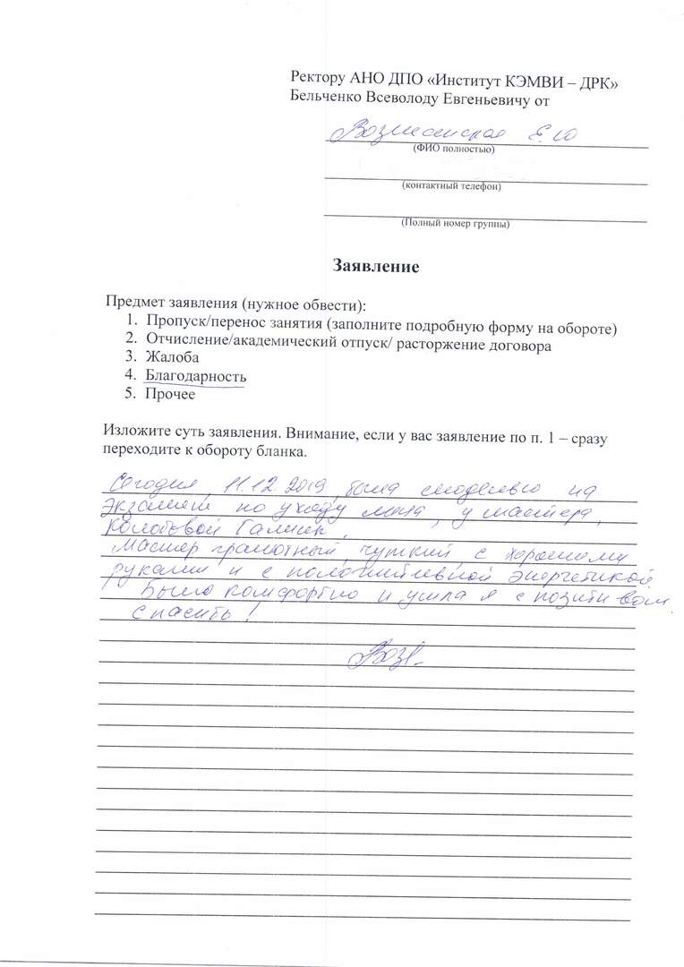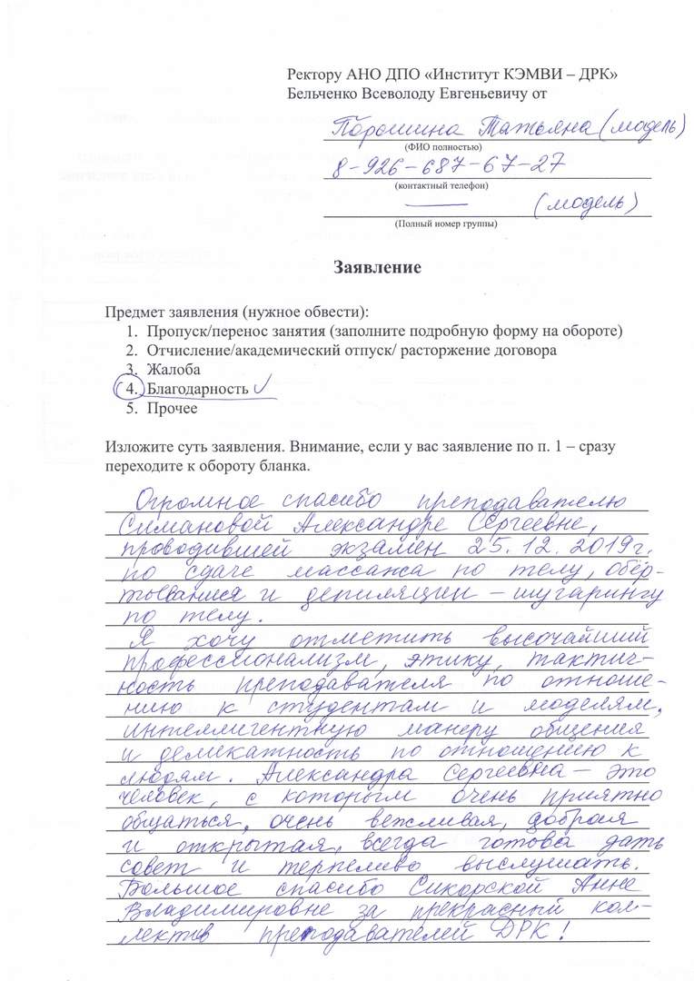 Огромное спасибо преподавателю Симановой Александре Сергеевне, проводившей экзамен 25.12.19 по сдаче массажа по телу, обертывания и депиляции - шугаринга по телу. Я хочу отметить высочайший профессионализм, этику, тактичность преподавателя по отношению к студентам и моделям, интеллигентную манеру общения и деликатность по отношению к людям. Александра Сергеевна - это человек, с которым очень приятно общаться, очень вежливая, добрая и открытая, всегда готова дать совет и терпеливо выслушать. Большое спасибо Сикорской Анне Владимировне за прекрасный коллектив преподавателей ДРК!